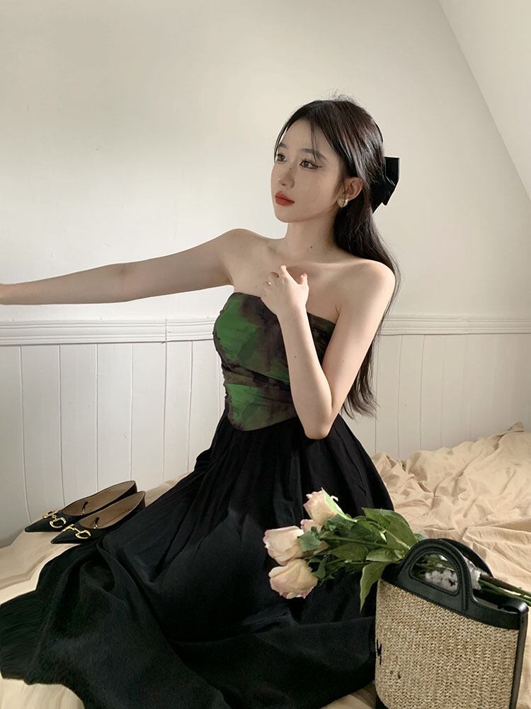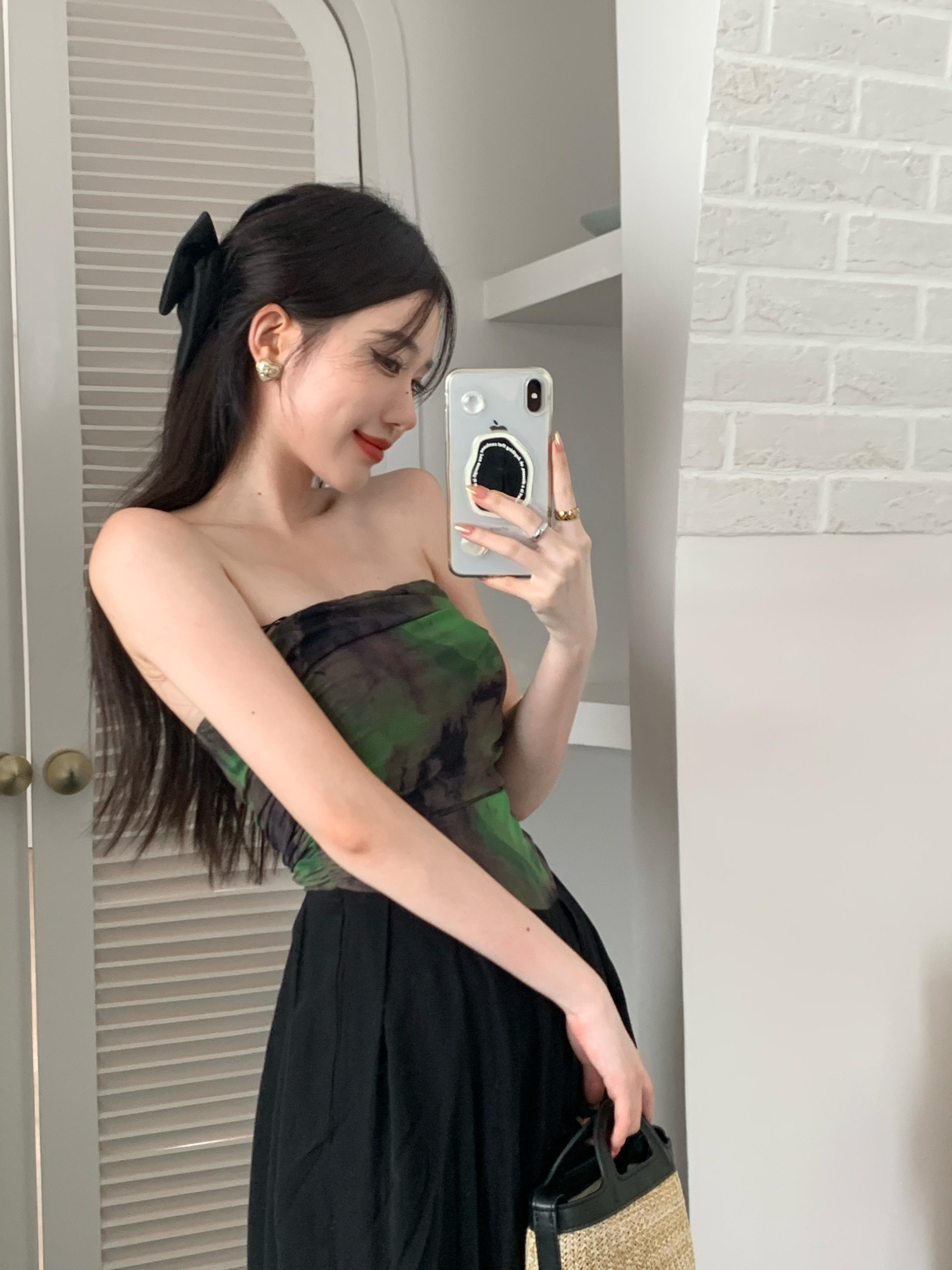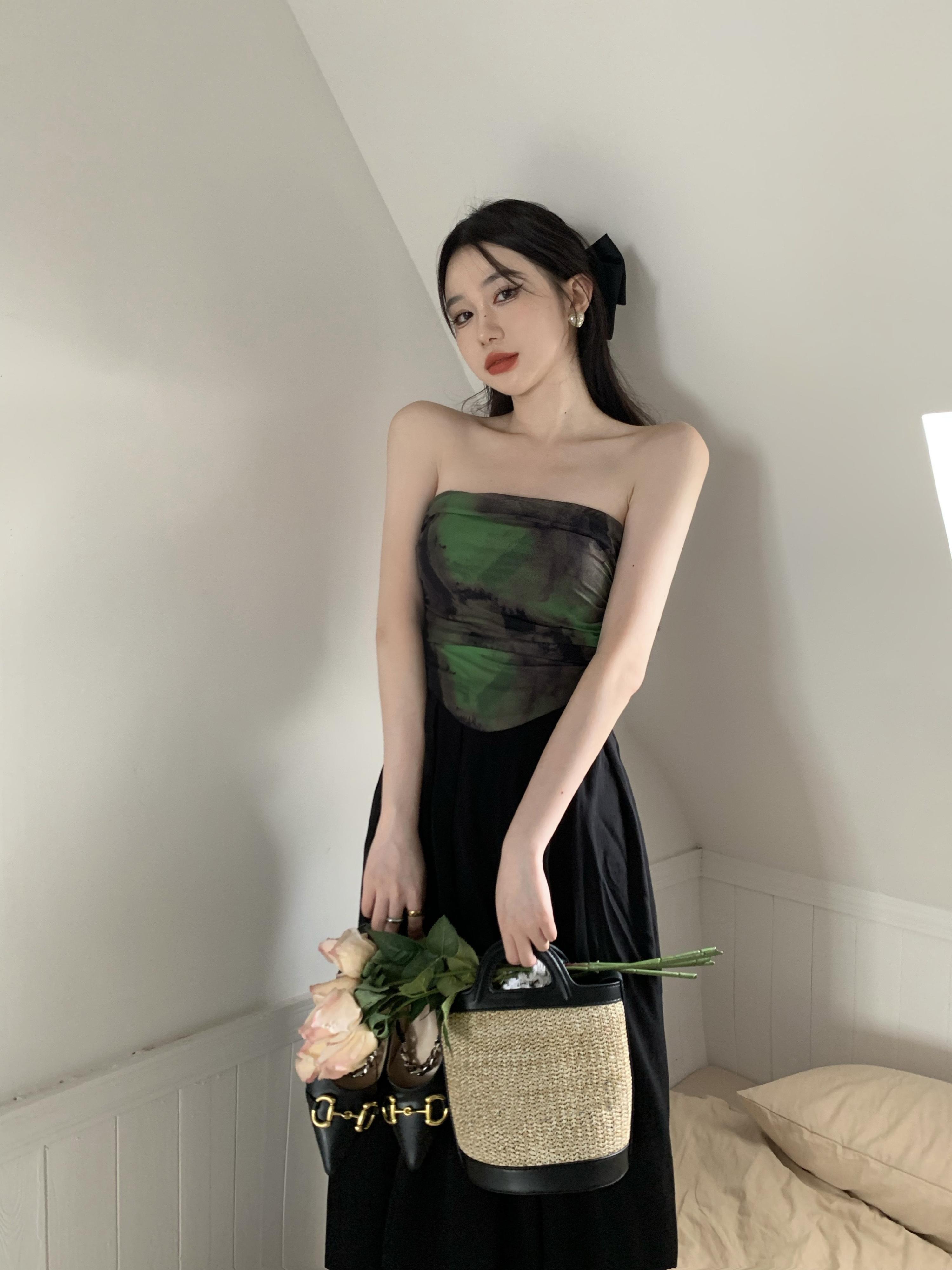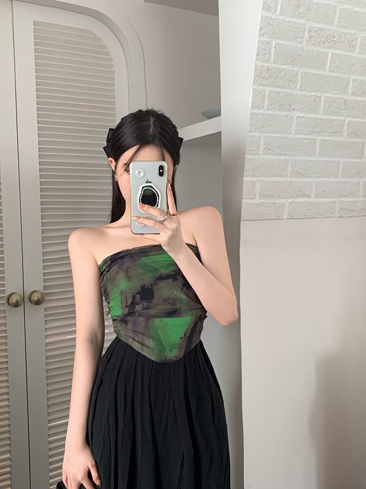 French tie-dye tube top dress women's summer 2022 new design pleated waist thin temperament skirt trendy プリーツ サマー 夏物 スカート 0921919526864799