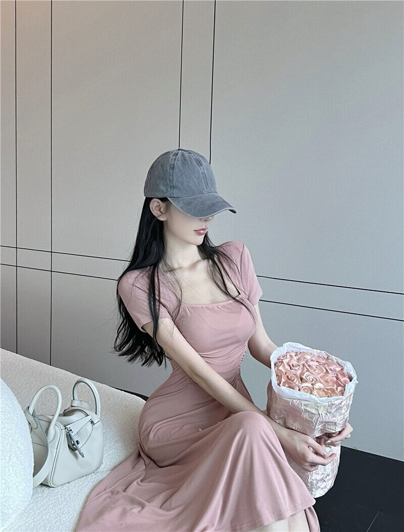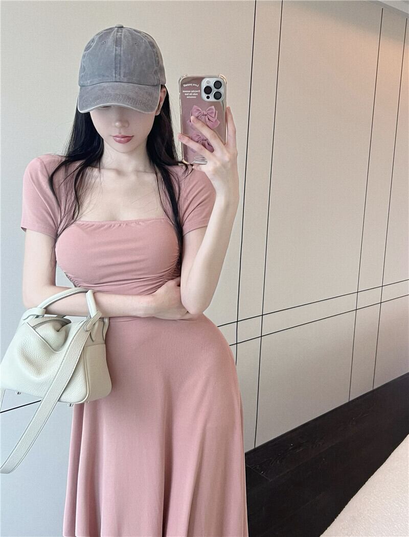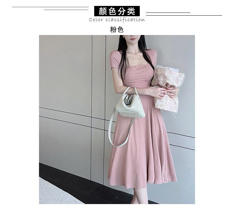 Gentle style square collar pink short-sleeved dress women's summer 2022 new pure desire waist mid-length skirt ピンク サマー 夏物 スカート ピュア スクウェア 0921910179511714