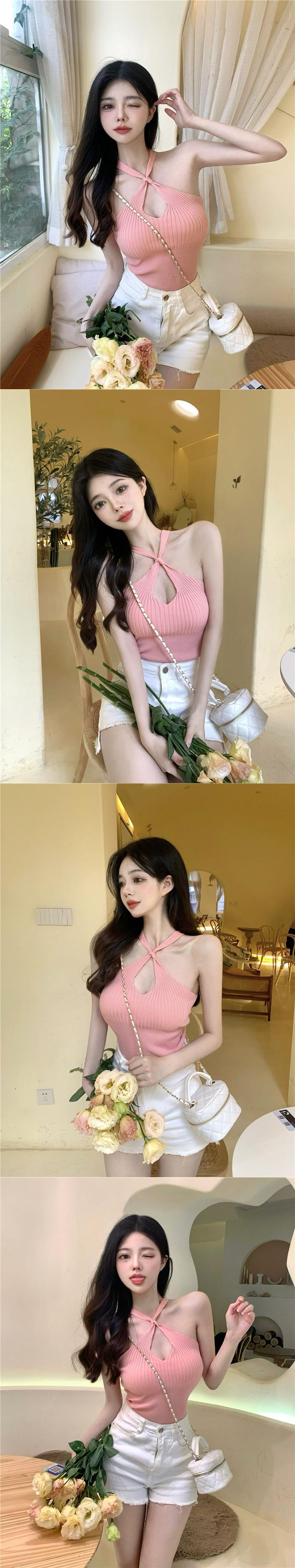 Pure desire style pink knitted kink halter vest women's inner wear summer 2022 new hollow slim short top ショート ピンク サマー 夏物 スリム 0921917892915223