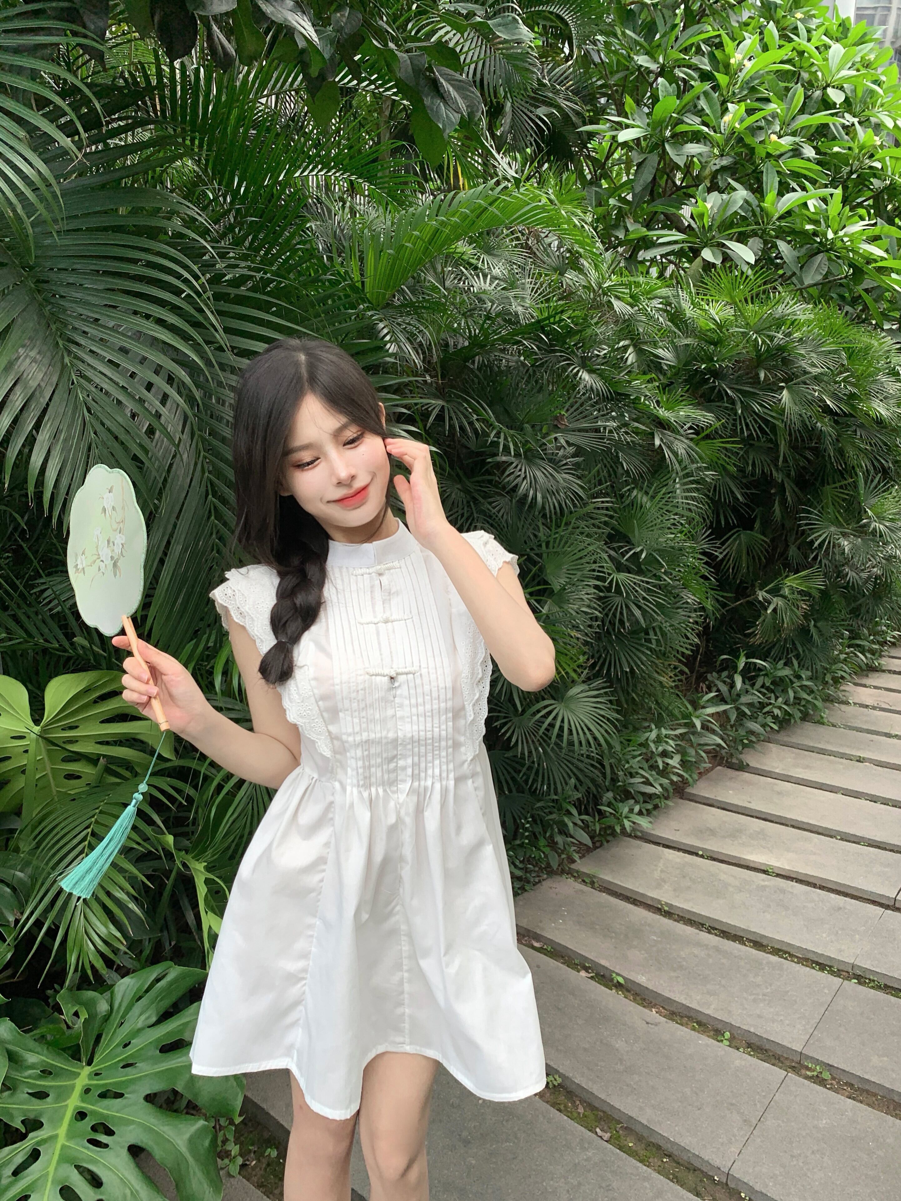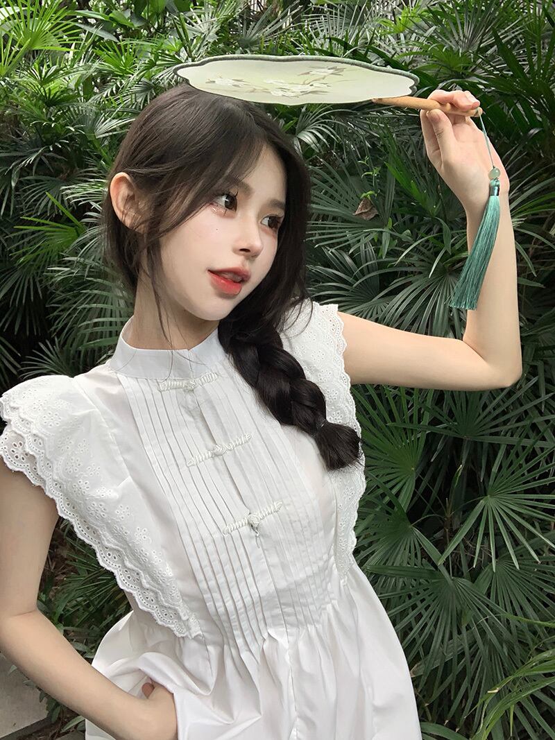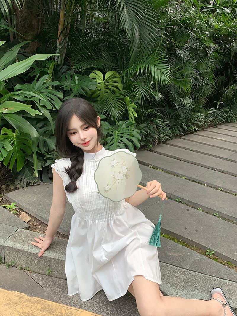 Chinese style stand-up collar buckle white dress women's summer 2022 new temperament flying sleeves waist A-line short skirt ショート ホワイト サマー 夏物 スカート Aライン 0921960414388647
