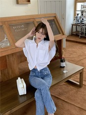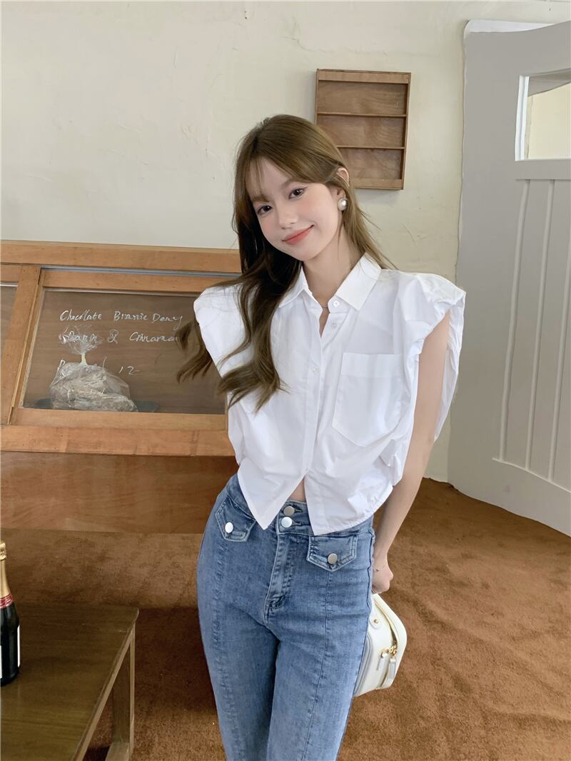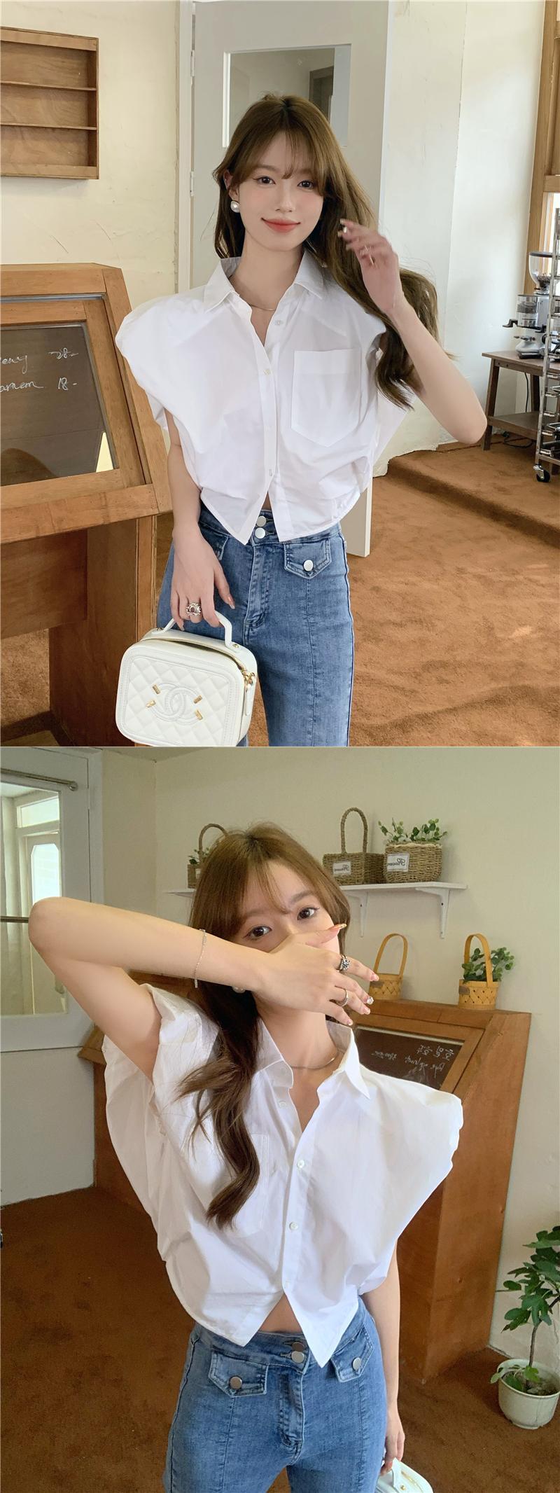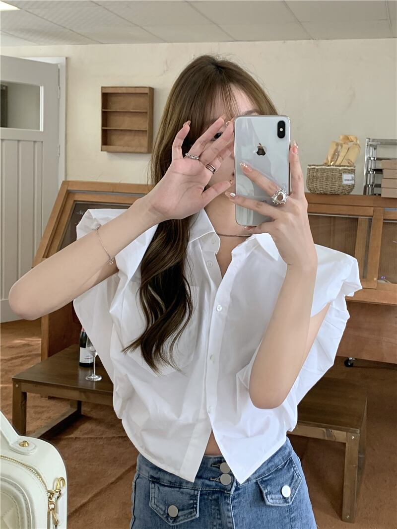 White shirt women's design sense niche summer 2022 new loose chic pocket short flying sleeve top trendy ショート ホワイト サマー 夏物 0921919059403505