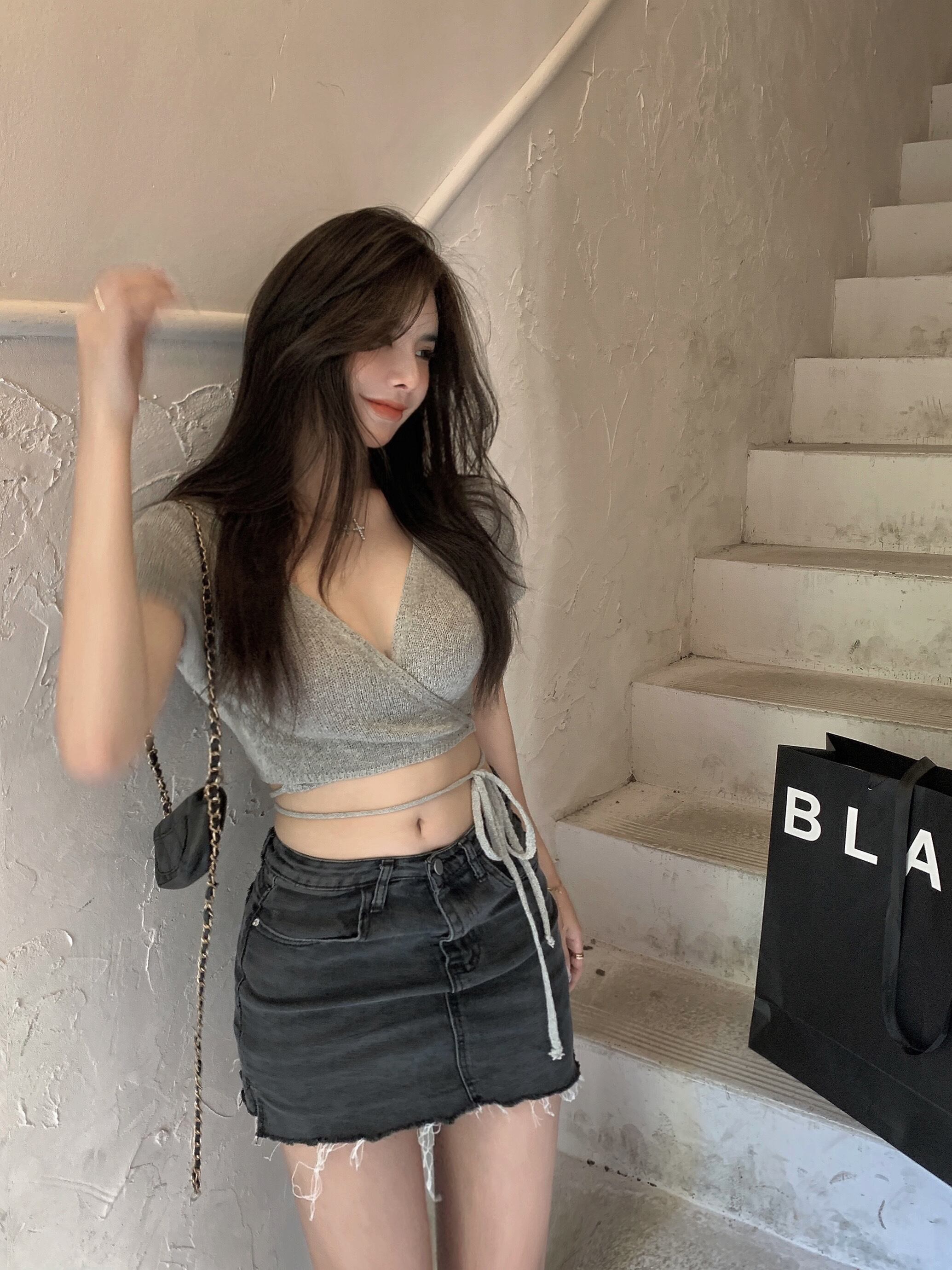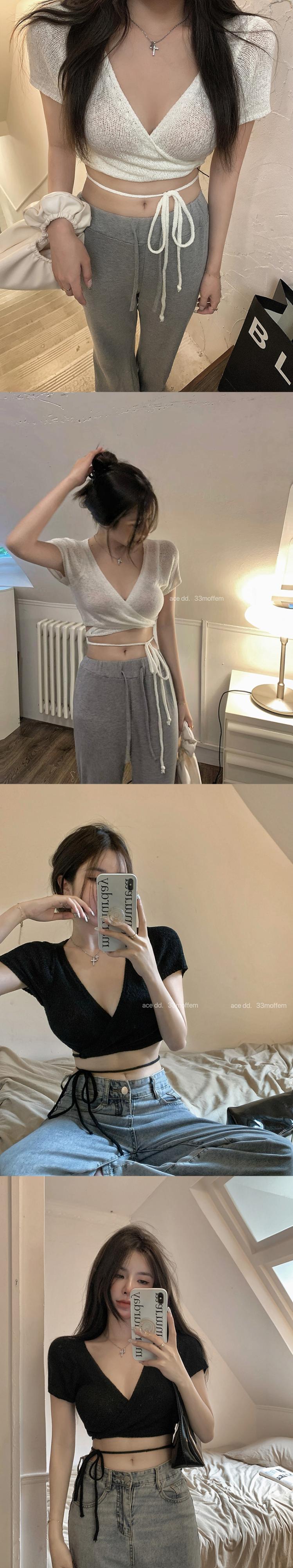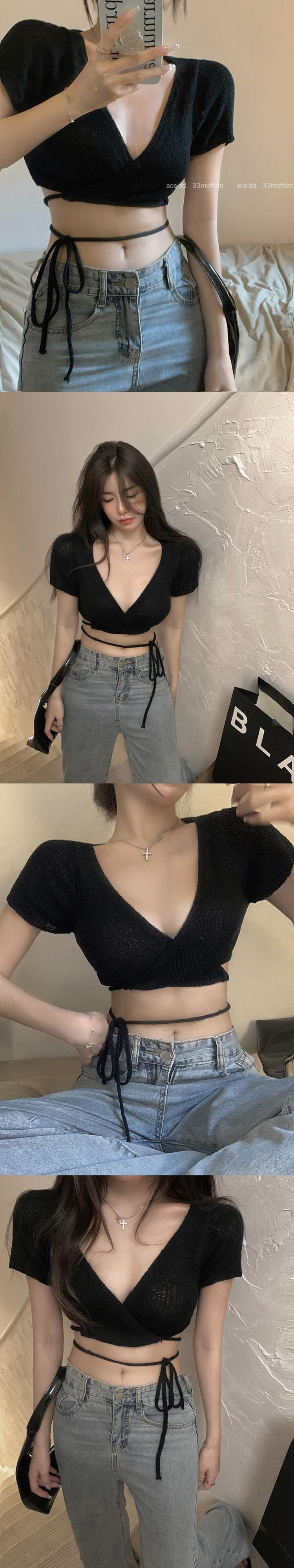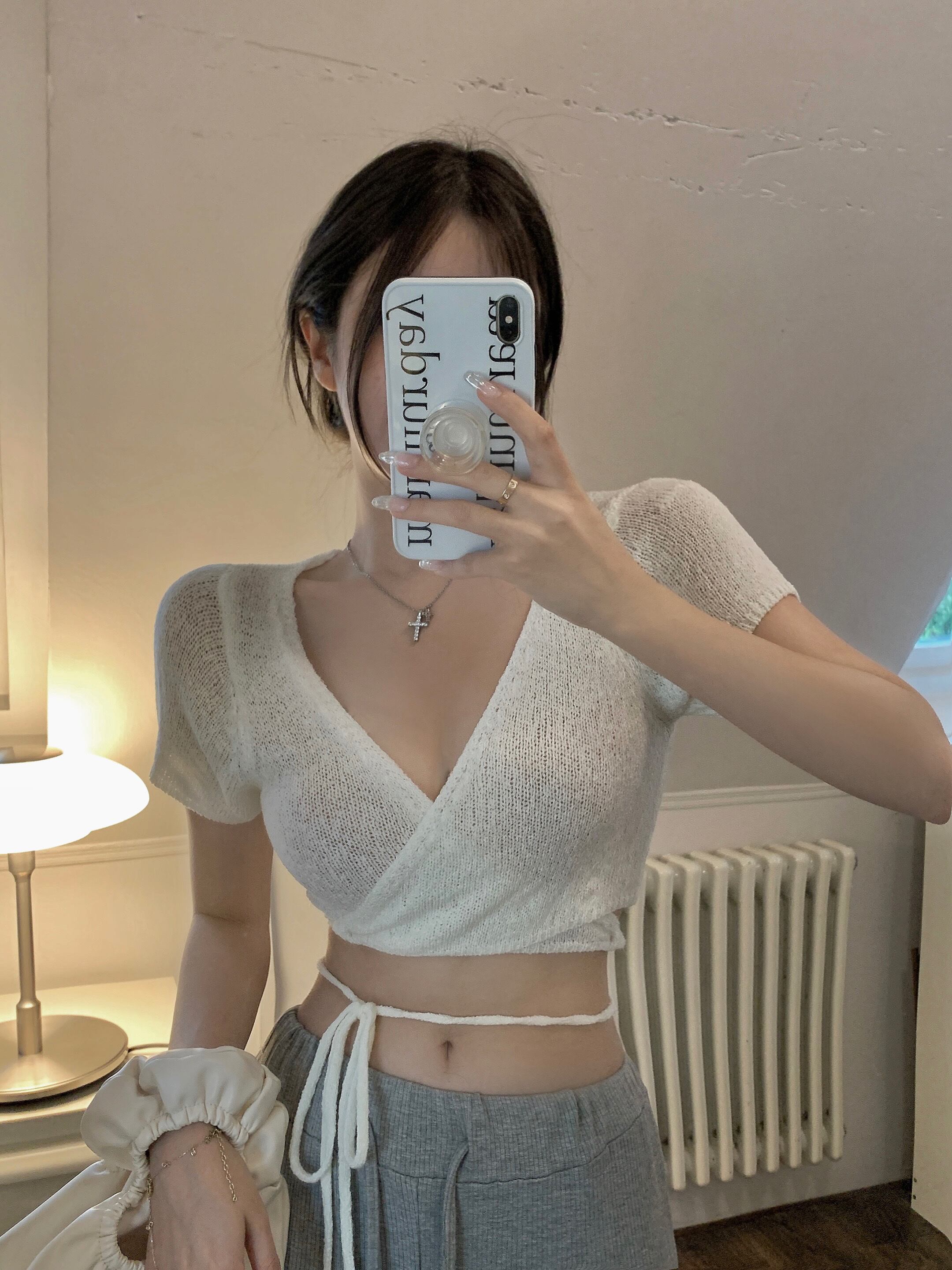 Hot sexy V-neck straps short-sleeved knitted T-shirt women's summer 2022 new chic temperament slim short top ショート サマー 夏物 Vネック スリム Tシャツ 0921933664698983