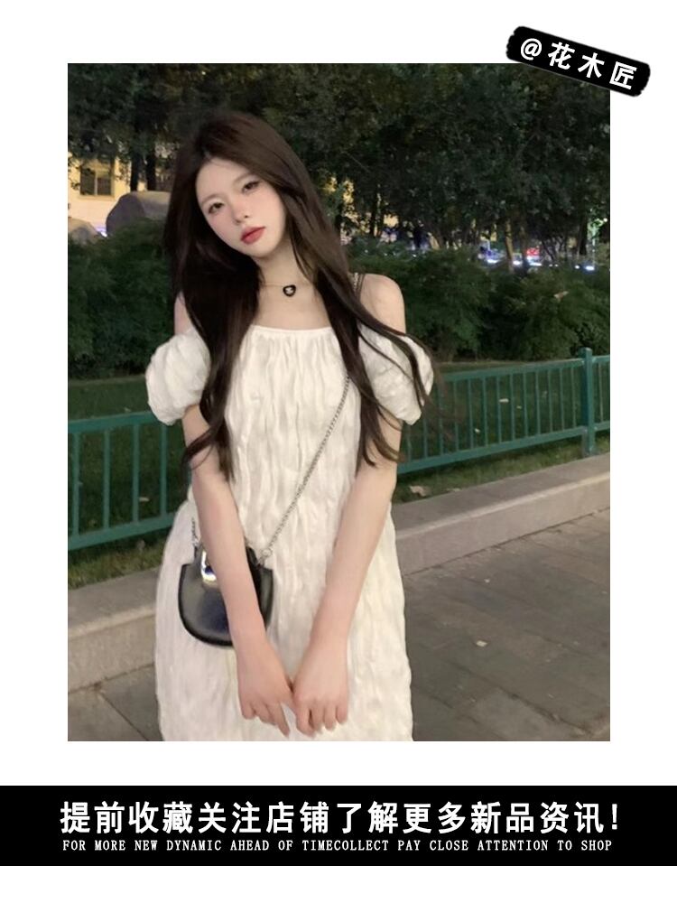French off-the-shoulder puff-sleeve suspender dress women's summer 2022 new chic waist mid-length pleated skirt プリーツ サマー 夏物 スカート 092194490906006