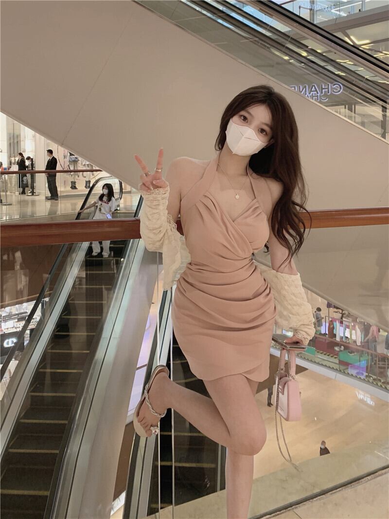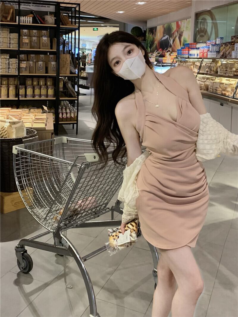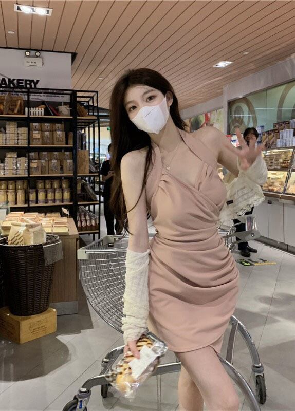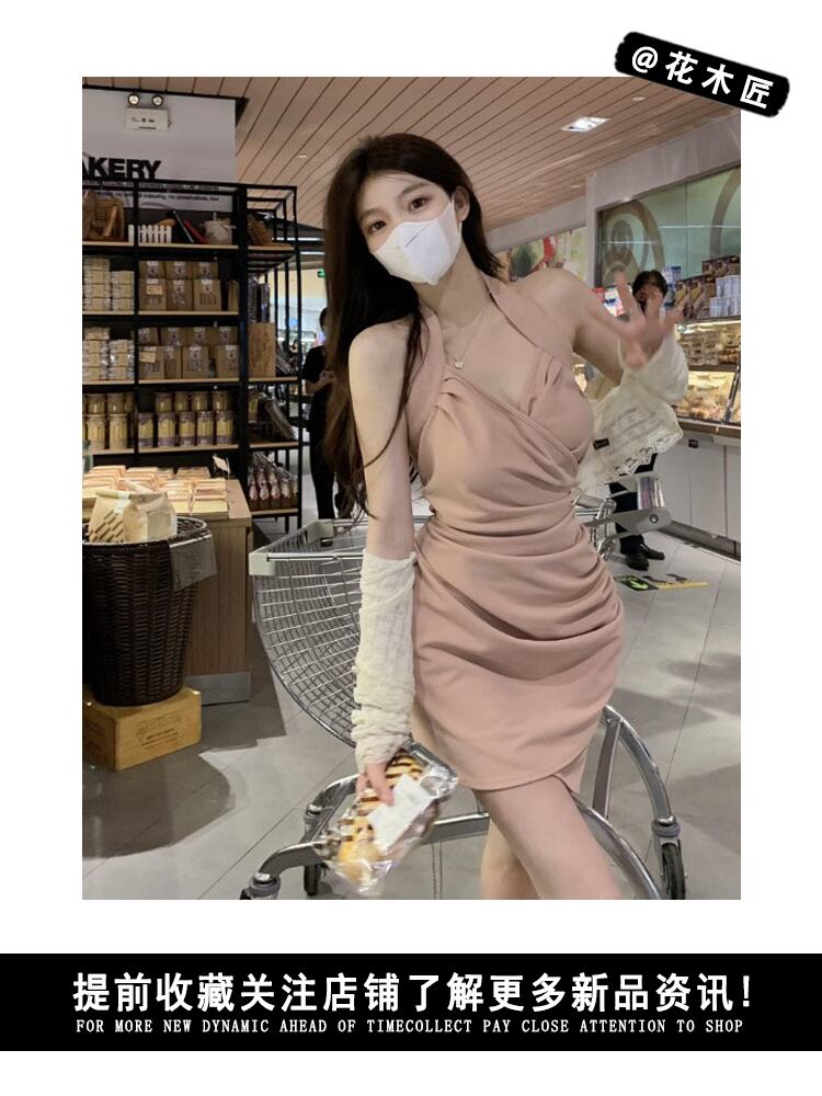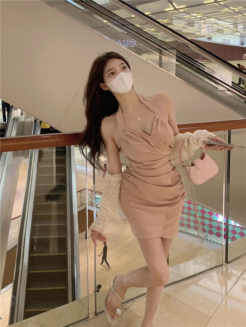 Pure desire style v-neck halter dress women's summer 2022 new temperament chic pleated waist slimming hip skirt プリーツ サマー 夏物 スカート Vネック 0921930261419729