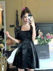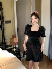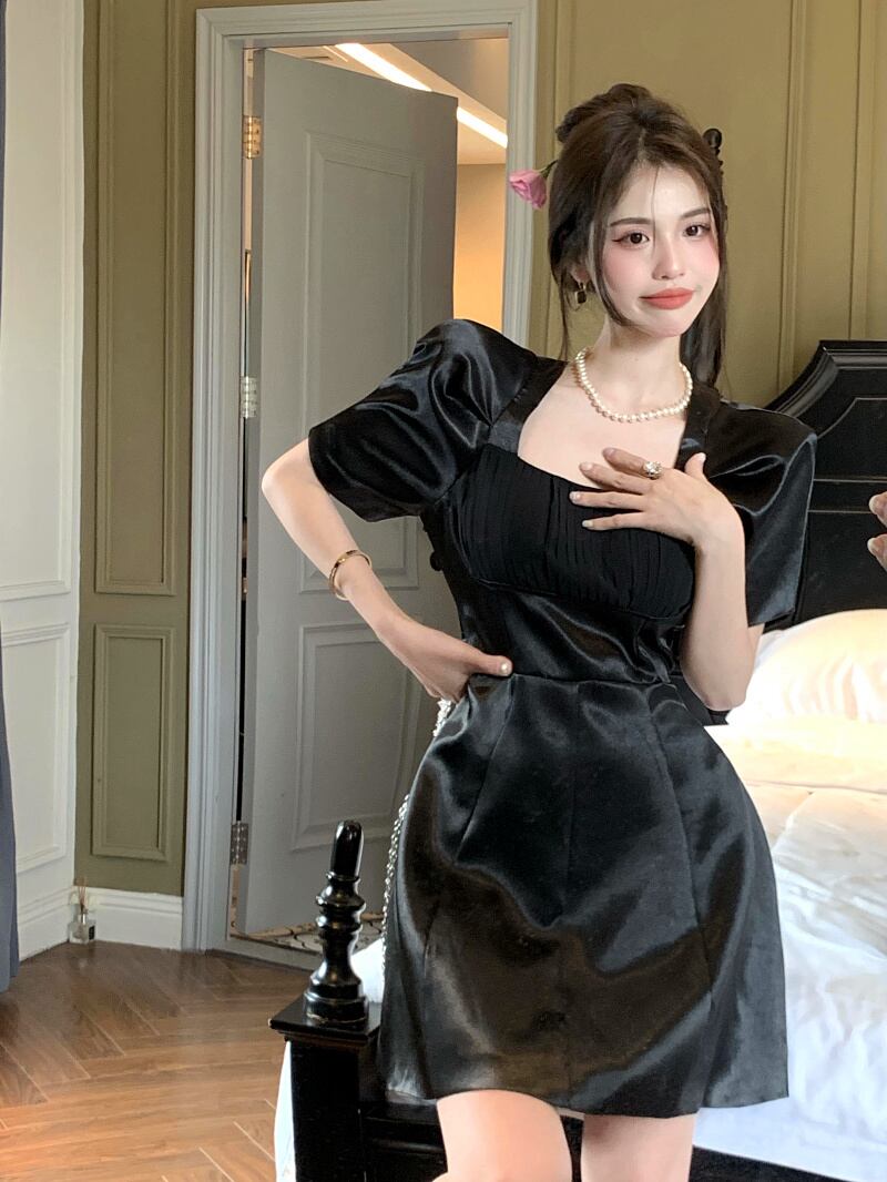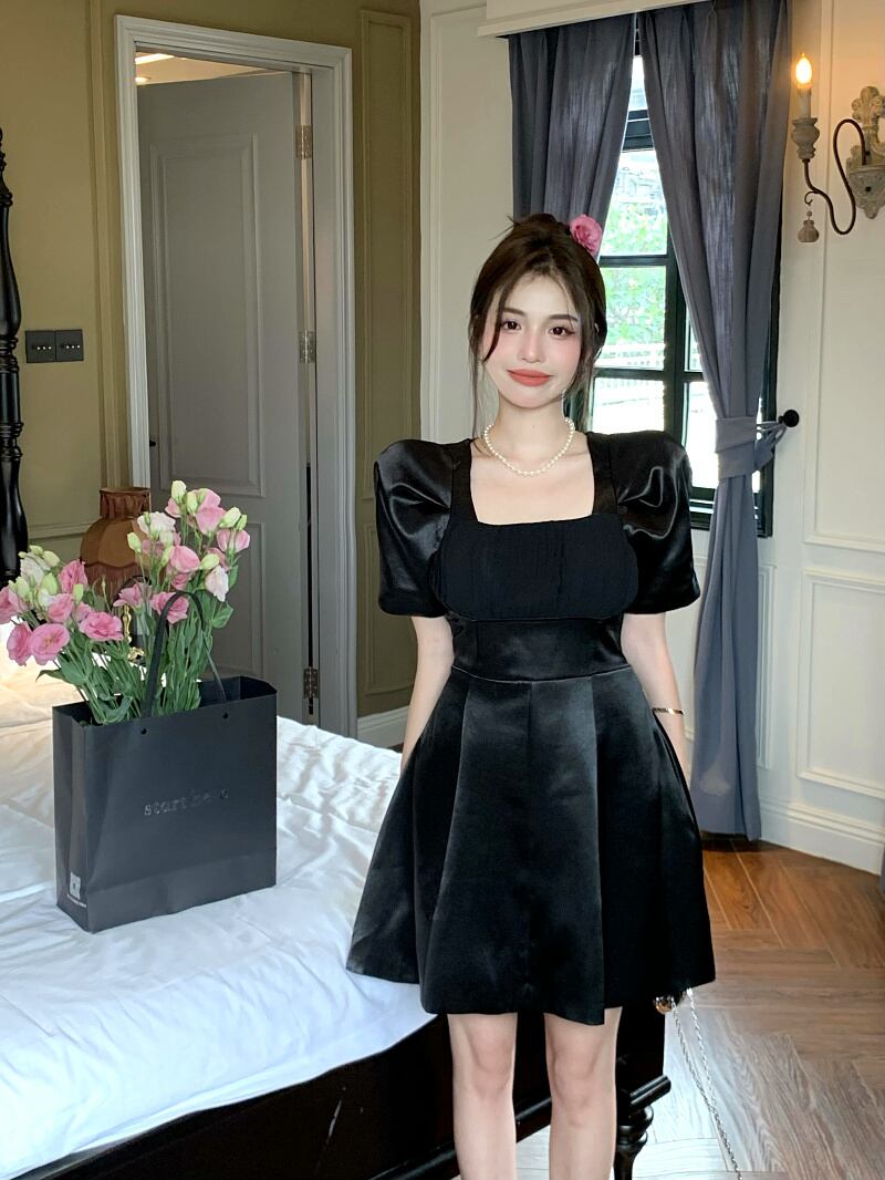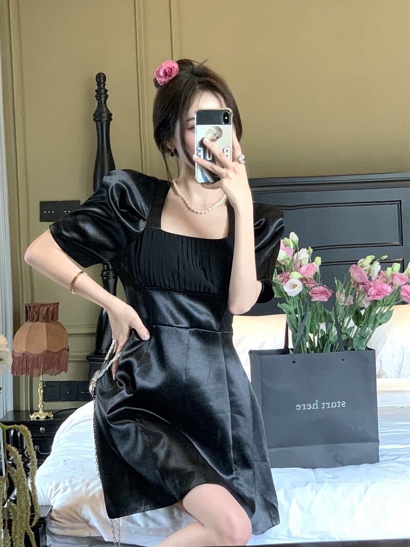 -quality chic satin black square-neck dress women's summer 2022 new French temperament waist A-line skirt ブラック サマー 夏物 スカート Aライン サテン スクウェア 0921960858893808