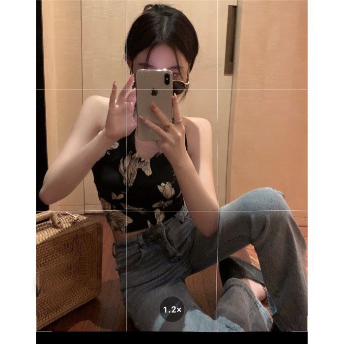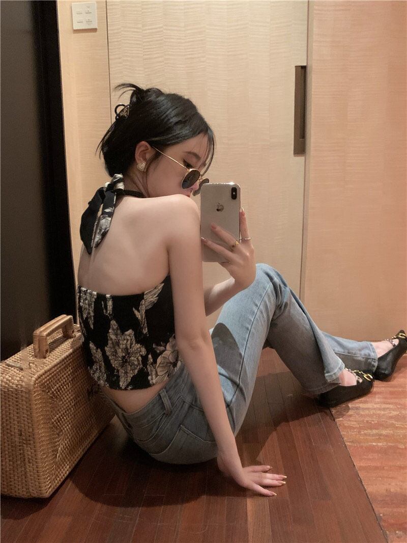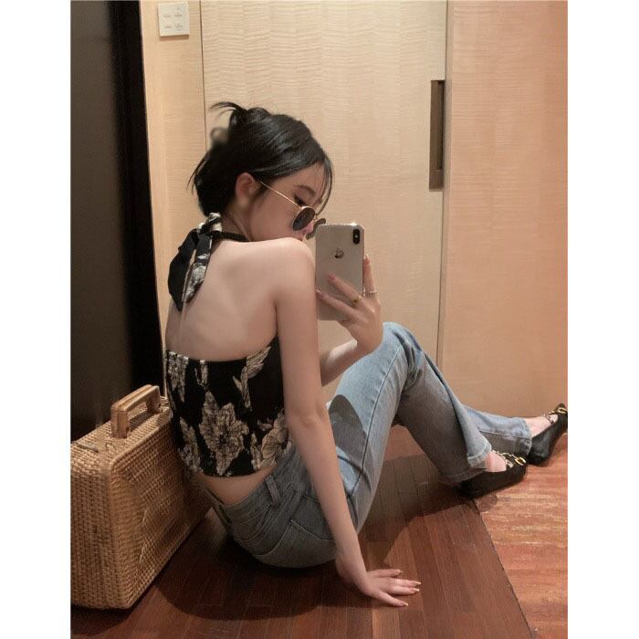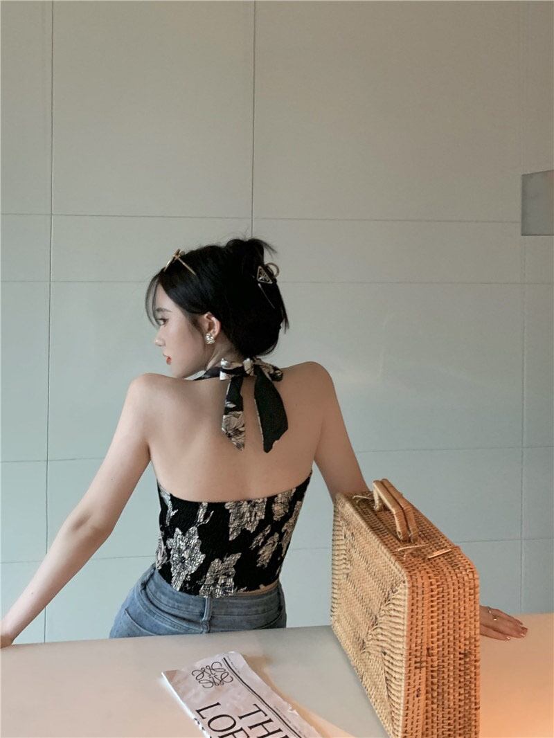 Retro print halter vest women's 2022 summer new backless short V-neck sleeveless outerwear trendy ショート レトロ サマー 夏物 ノースリーブ Vネック 0921999590837129