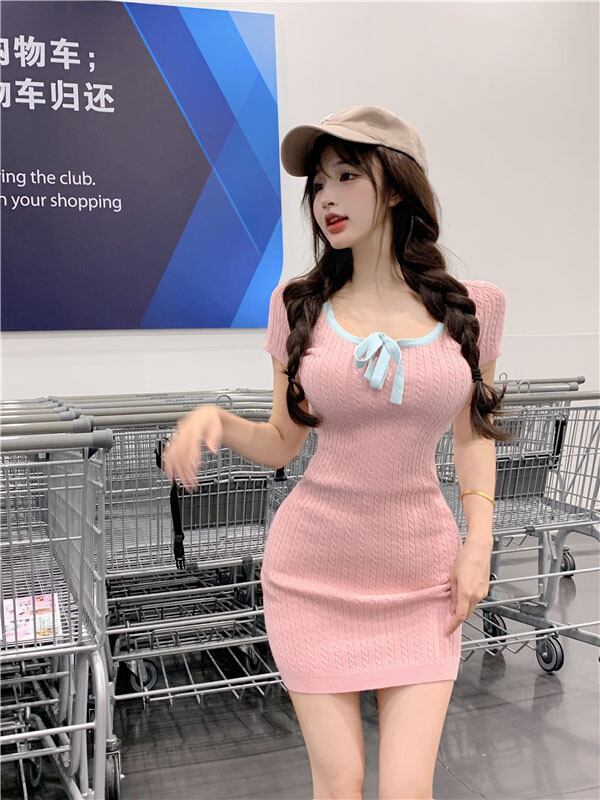 Pure desire wind U-neck contrast color lace-up knitted dress women's summer 2022 new temperament tight-fitting waist bag hip skirt レース サマー 夏物 スカート レースアップ 0921930291651713