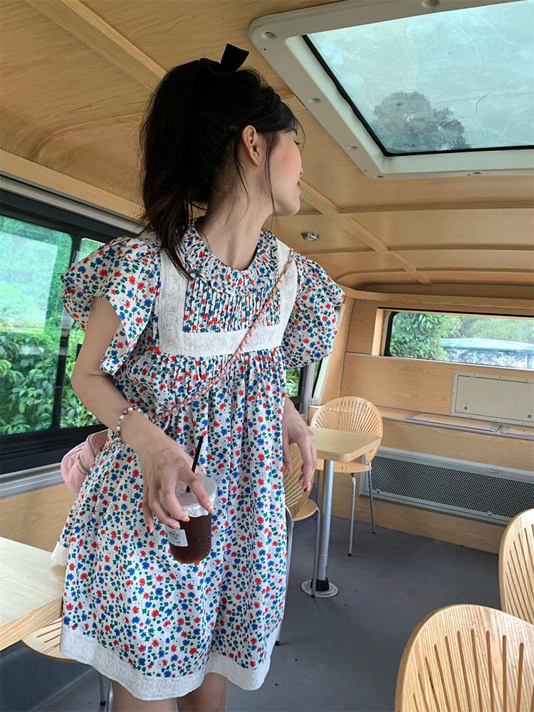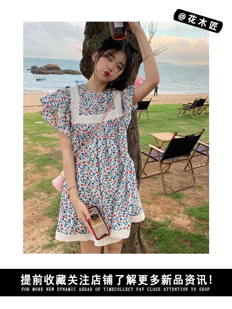 French floral flying sleeve dress women's summer 2022 new design pleated loose and thin skirt プリーツ サマー 夏物 花柄 スカート 0921947237092041