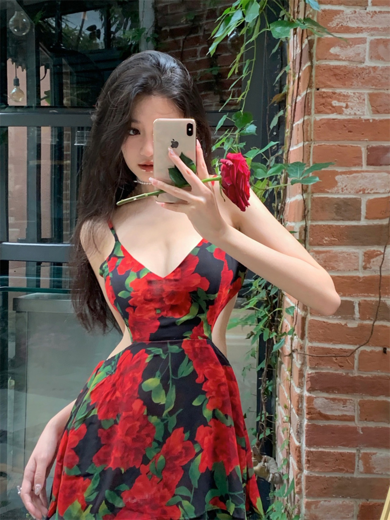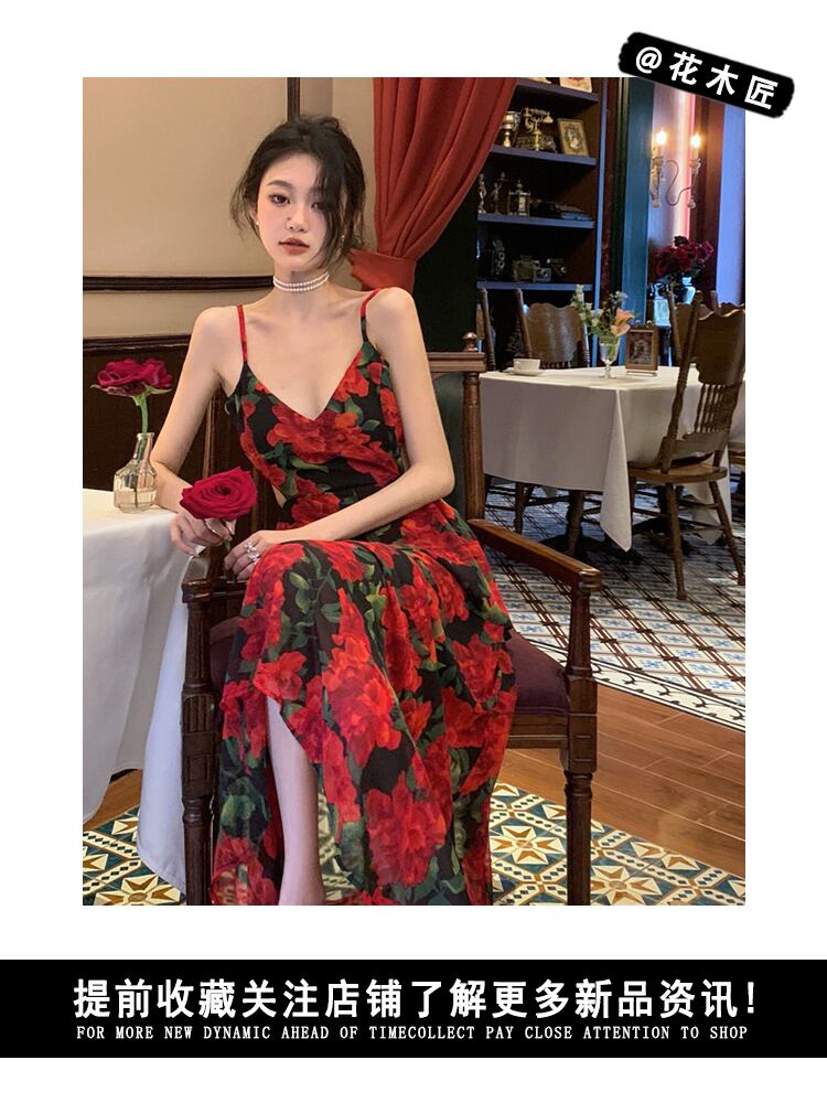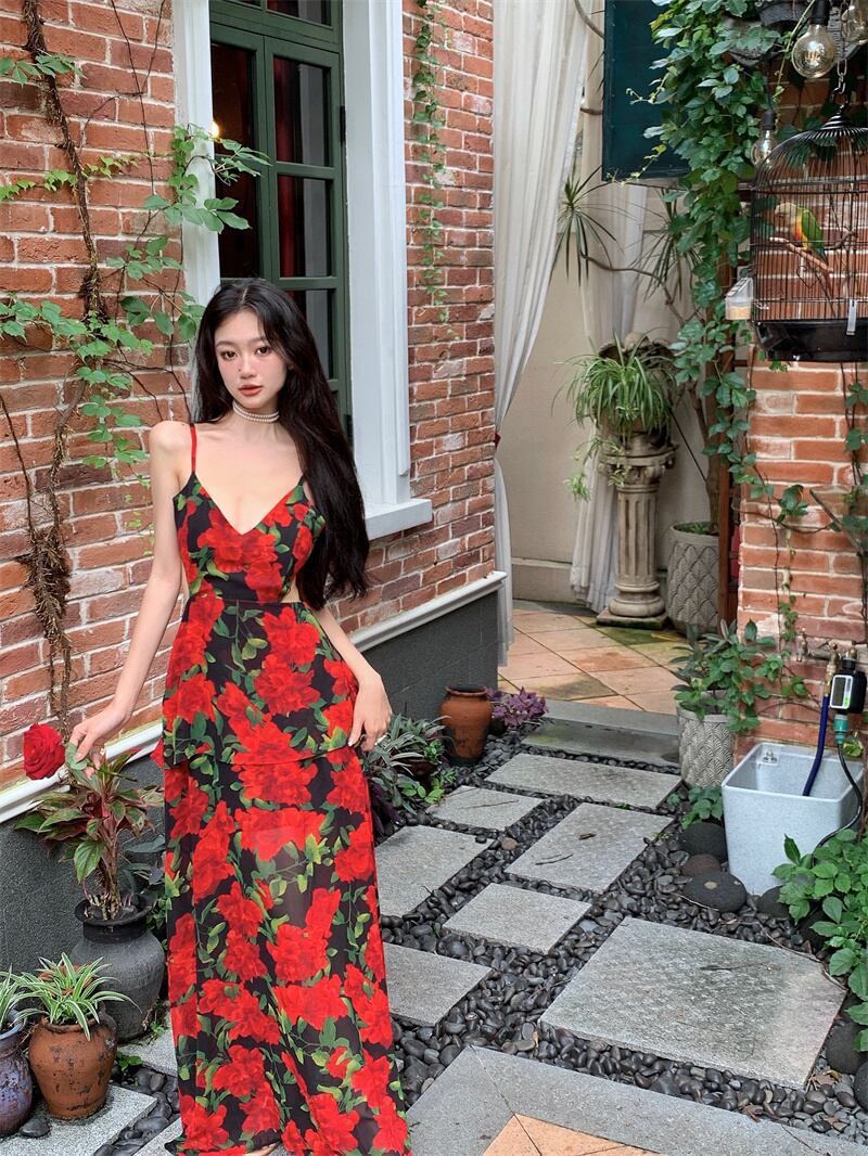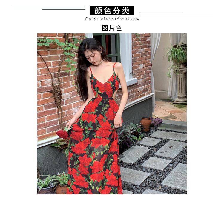French V-neck floral chiffon suspender dress women's summer 2022 new temperament backless waist long skirt trendy ロング シフォン サマー 夏物 花柄 スカート Vネック 0921968043995388