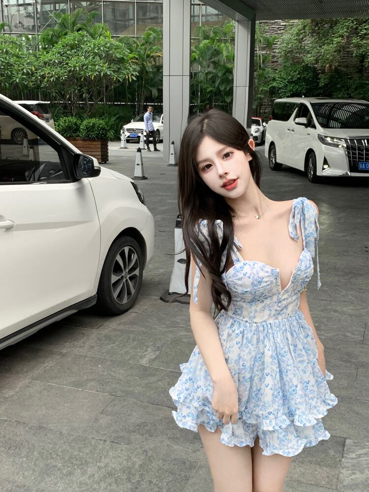 Pure desire wind blue floral suspender dress female summer 2022 new careful machine half open collar waist cake skirt ブルー サマー 夏物 花柄 スカート 0921985907428408
