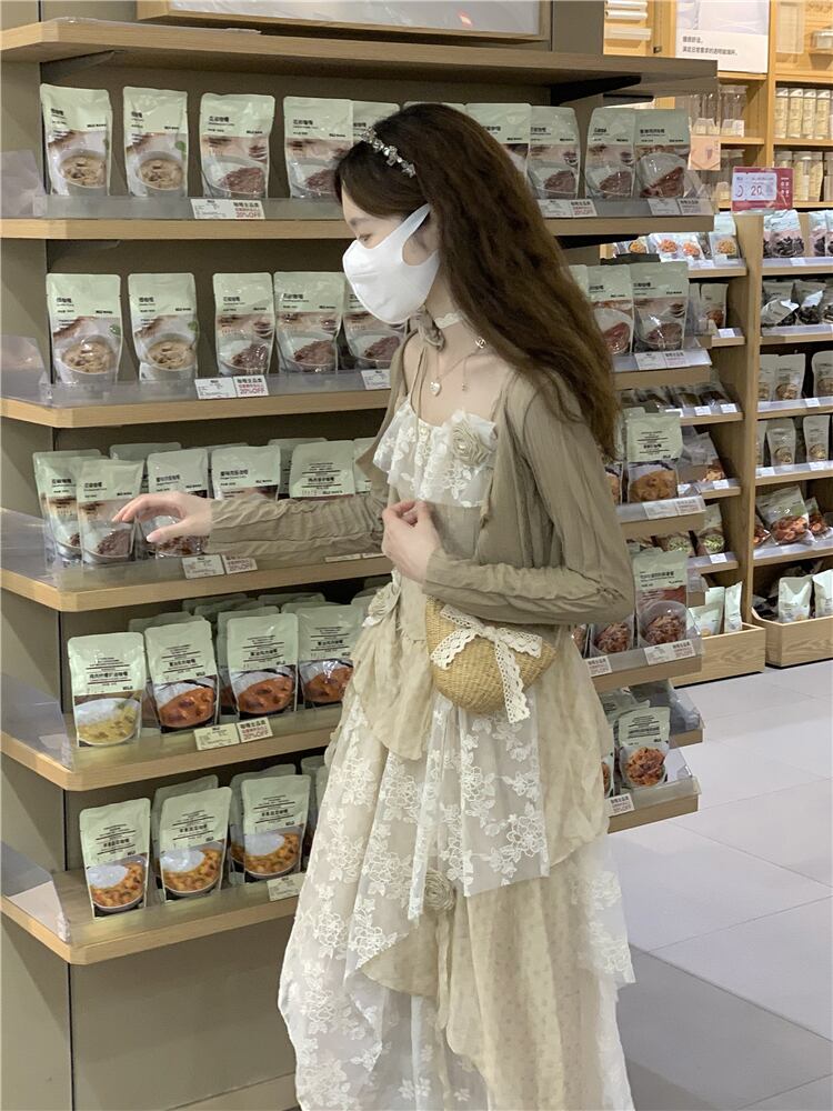 -quality three-dimensional flower suspender dress women's summer 2022 new waist stitching lace mid-length skirt レース サマー 夏物 スカート フラワーデザイン ステッチ 0921992447051125