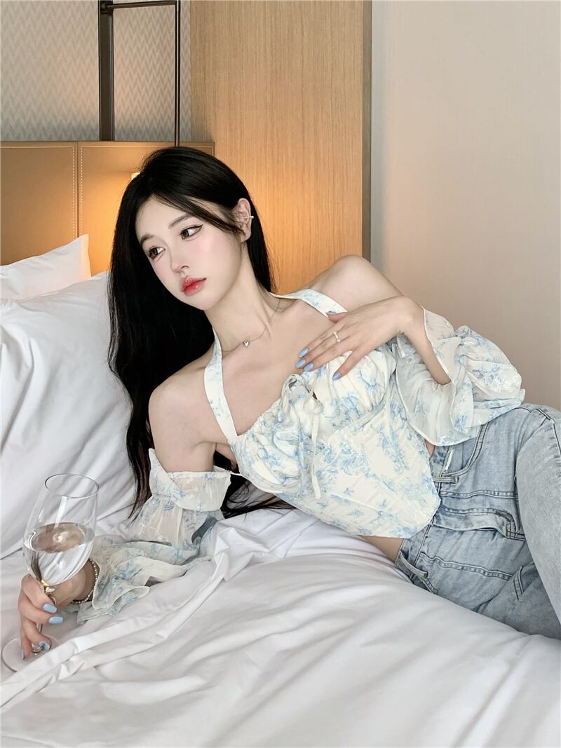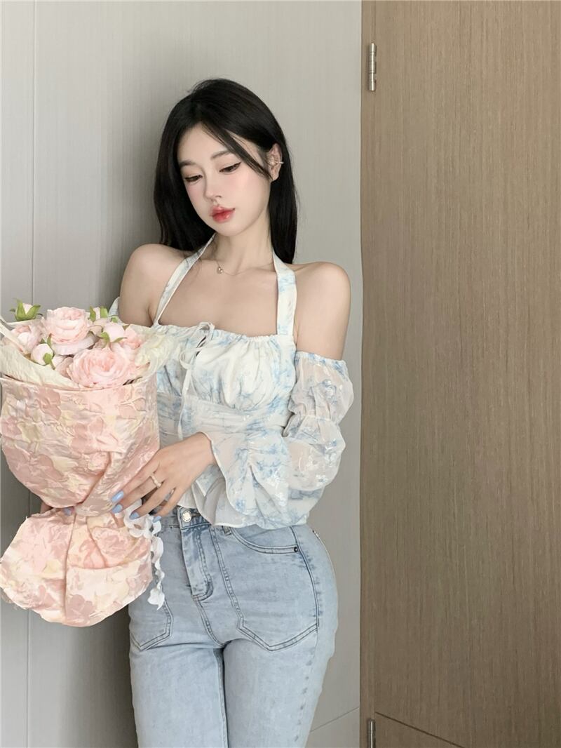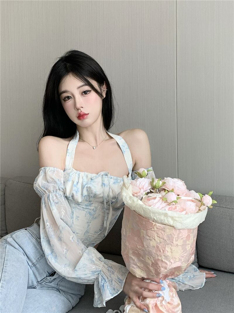 -quality temperament hanging neck floral shirt women's summer 2022 new pure desire off-the-shoulder irregular short top trend ショート サマー 夏物 花柄 ピュア 0921940166956133