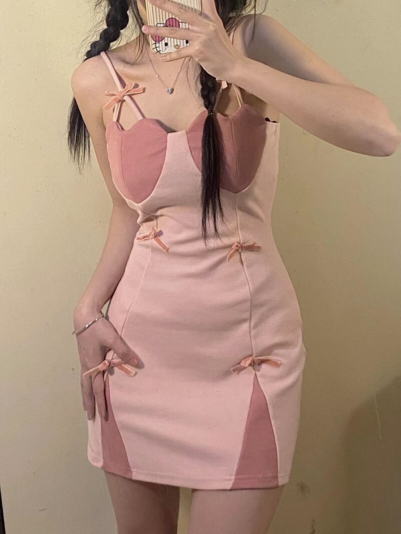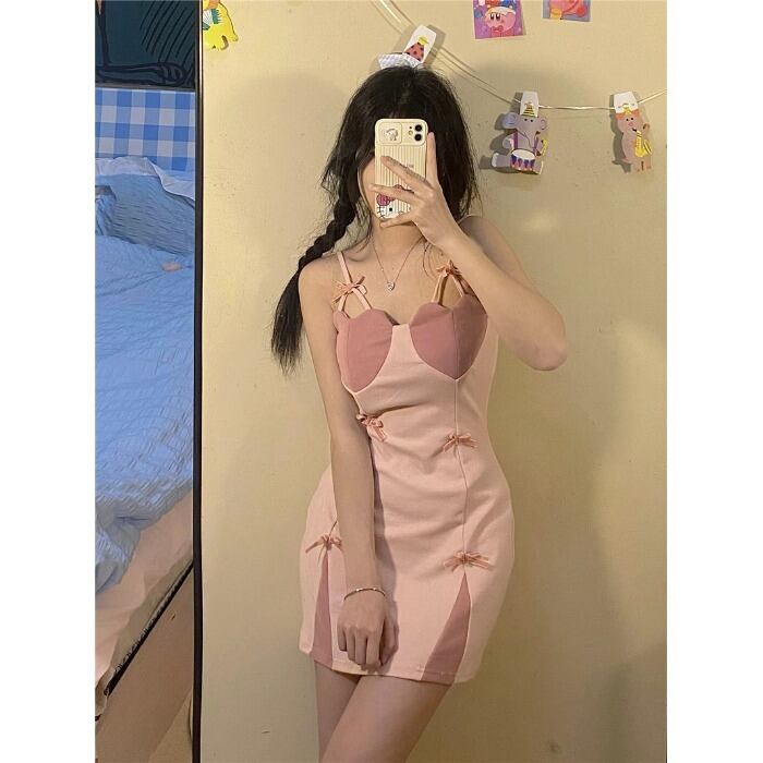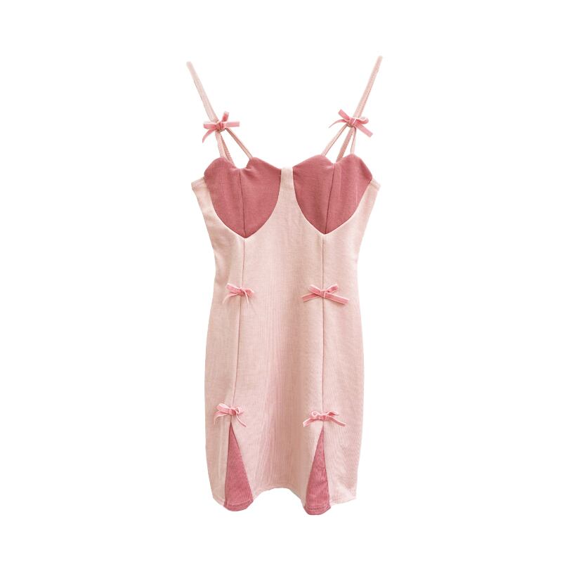 Sweet and spicy style contrast color love bow suspender dress women's summer 2022 new waist and thin A-line skirt リボン 大人ガーリー スウィート キュート カジュアル サマー 夏物 スカート Aライン 0921981230143627