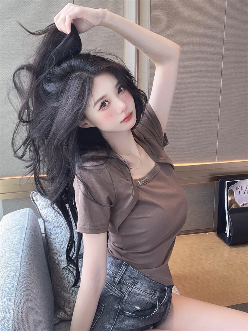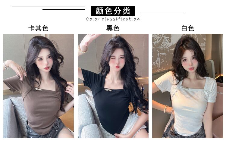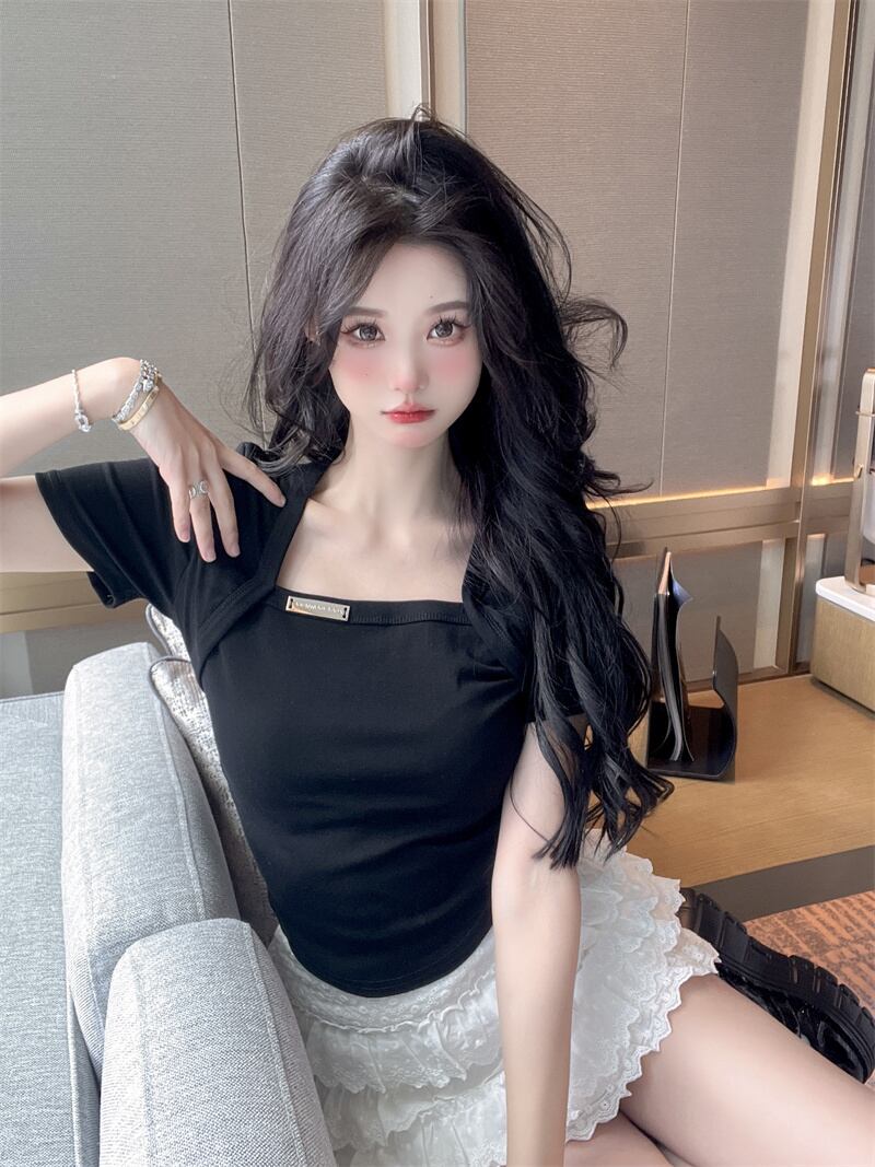 Hot chic square collar short-sleeved T-shirt women's design sense niche summer 2022 new all-match slim short top ショート サマー 夏物 スリム Tシャツ スクウェア 0921982840956416