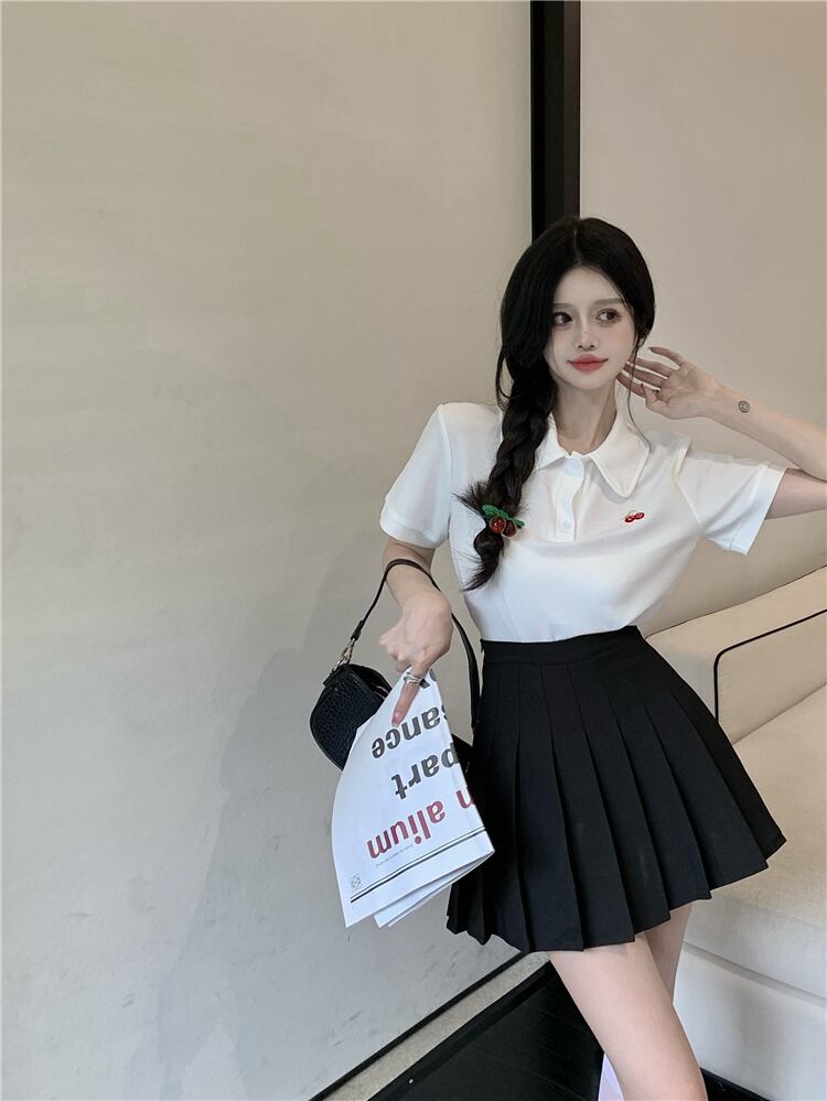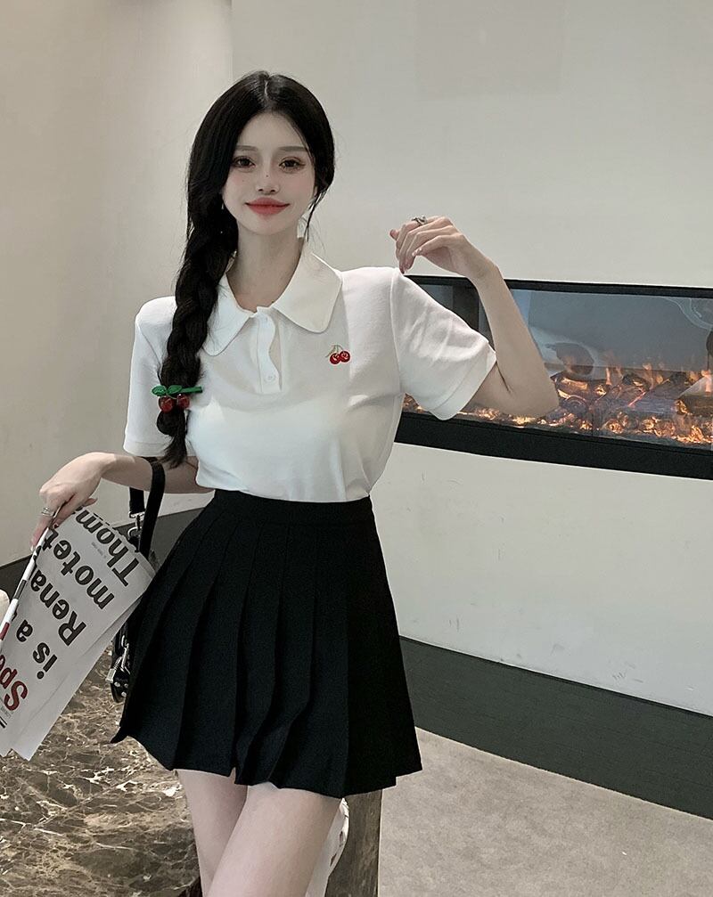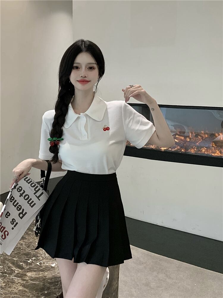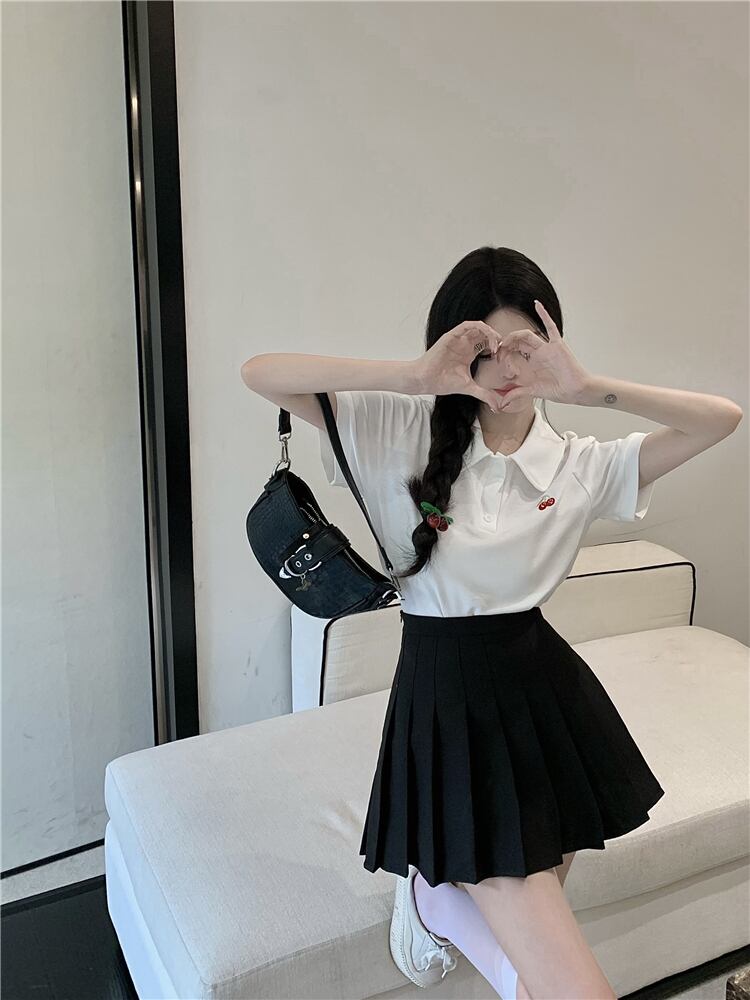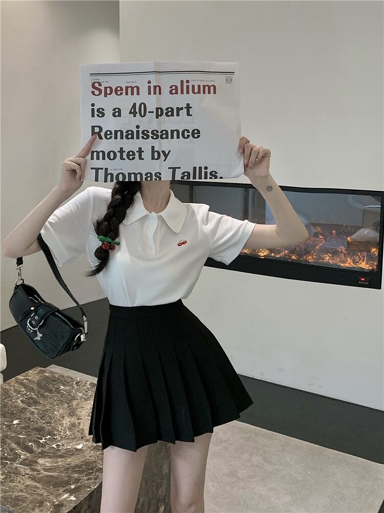 Net red age-reducing polo collar cherry short-sleeved T-shirt women's summer 2022 new chic loose chic black top レッド ブラック サマー 夏物 Tシャツ 0921934731342152