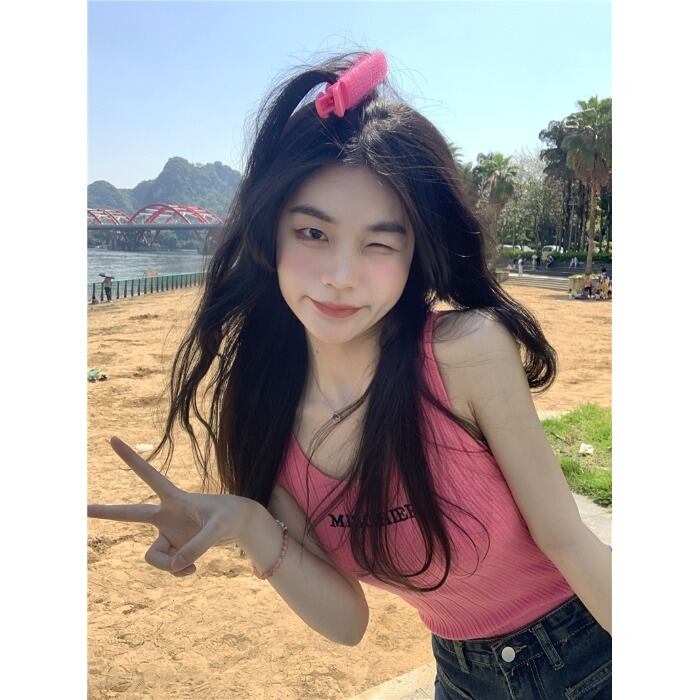 Sweet and spicy pink knitted vest women's inner wear summer 2022 new chic letter slim short top outer wear ショート ピンク 大人ガーリー スウィート キュート カジュアル サマー 夏物 スリム 0921940637080518