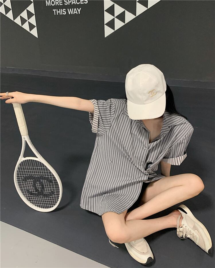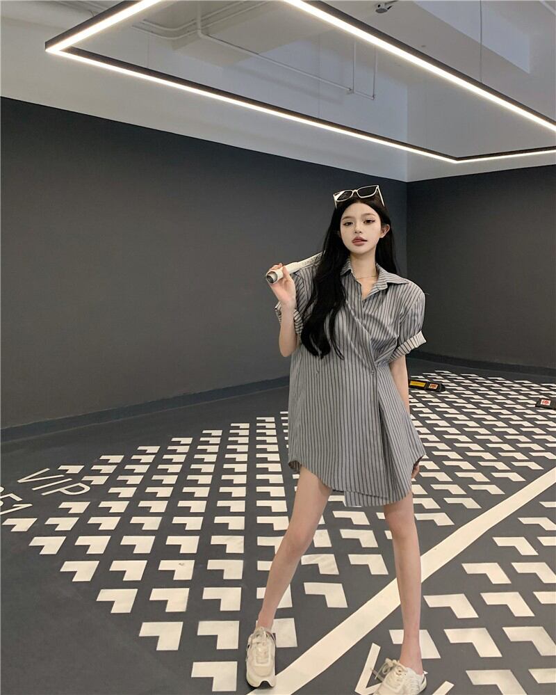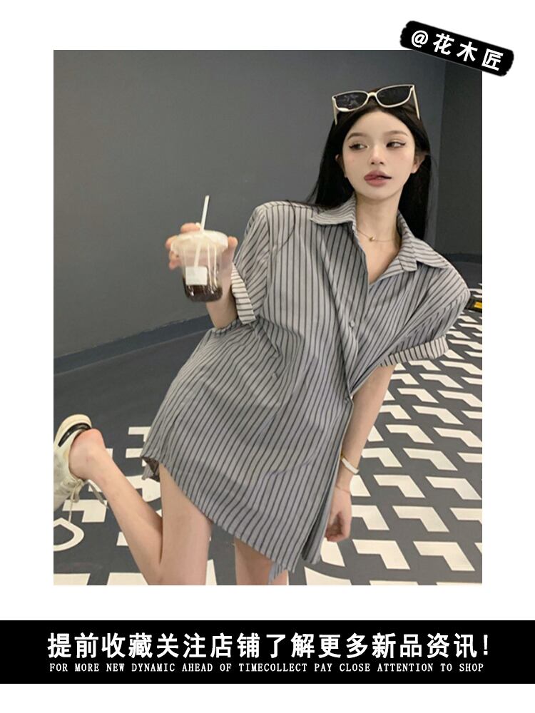 bf style gray striped short-sleeved shirt women's high-end summer 2022 new lazy style loose mid-length top サマー 夏物 ストライプ 0921914079454784