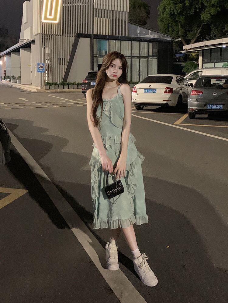 French contrast color suspender dress female summer 2022 new temperament lotus leaf waist mid-length slit skirt サマー 夏物 スカート 0921957171382863