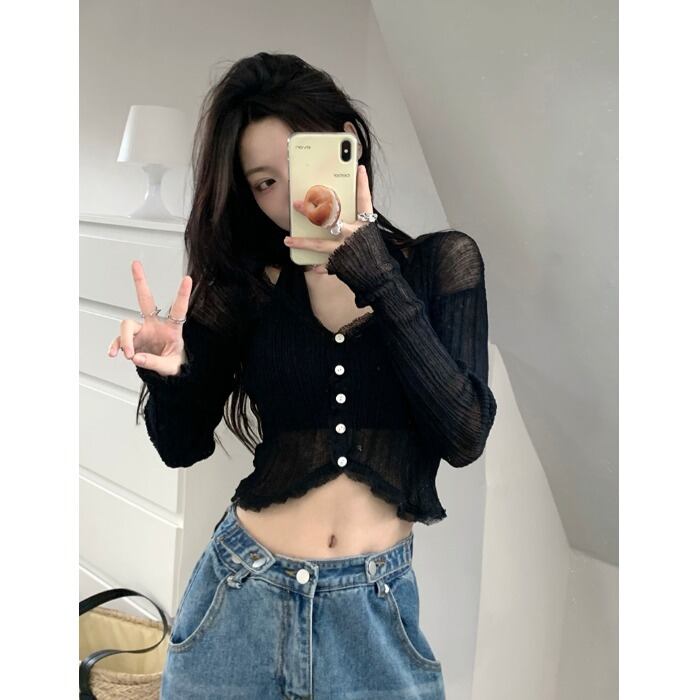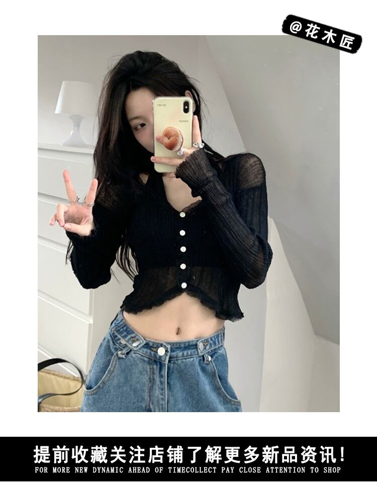 Hot thin sunscreen cardigan long-sleeved knitted sweater women's summer 2022 new V-neck slim chic short top ショート ロング カーディガン サマー 夏物 Vネック スリム 0921957629960032