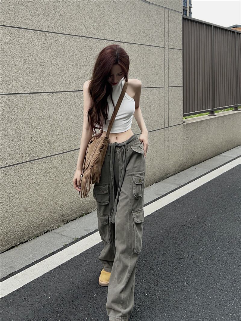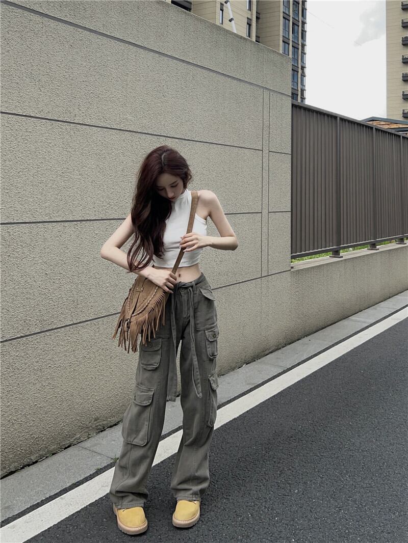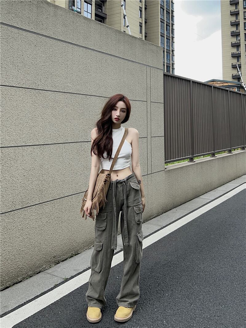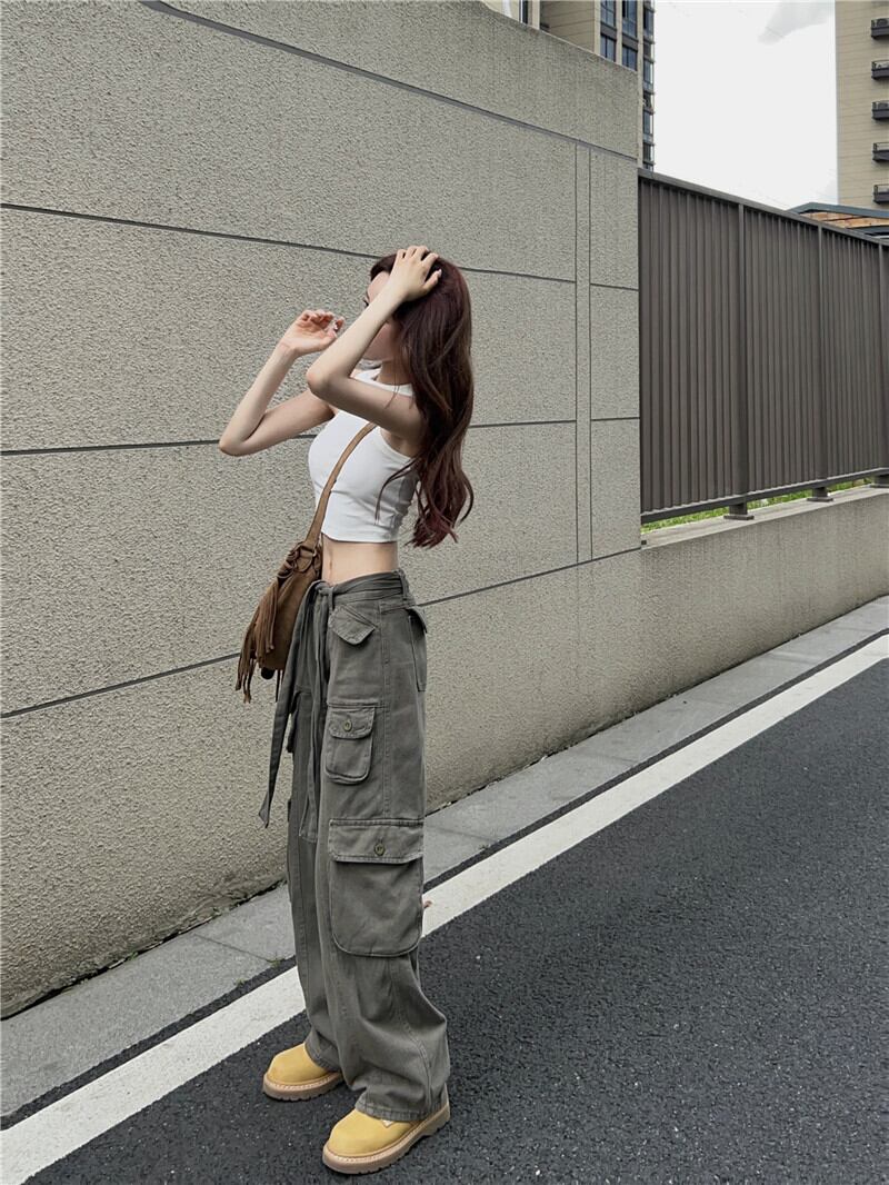 Retro overalls casual pants women's summer 2022 new design sense multi-pocket high waist loose thin wide leg pants trend ハイウェスト レトロ カジュアル サマー 夏物 ワイドレッグ ワイドパンツ ポケット多め マルチポケット 0921924249077806