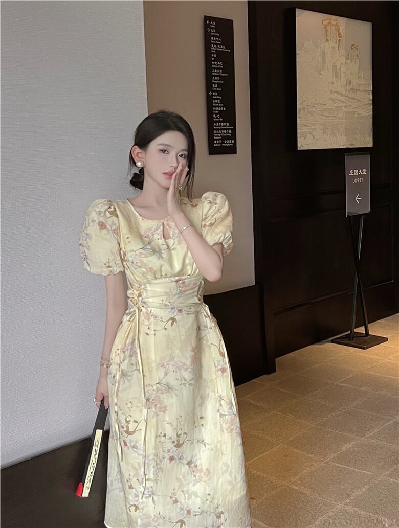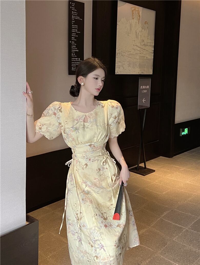 Retro Floral Puff Sleeve Dress Women Summer 2022 Hollow Tie Waist Mid-Length A-Line Skirt レトロ サマー 夏物 花柄 スカート Aライン 0921919419522810
