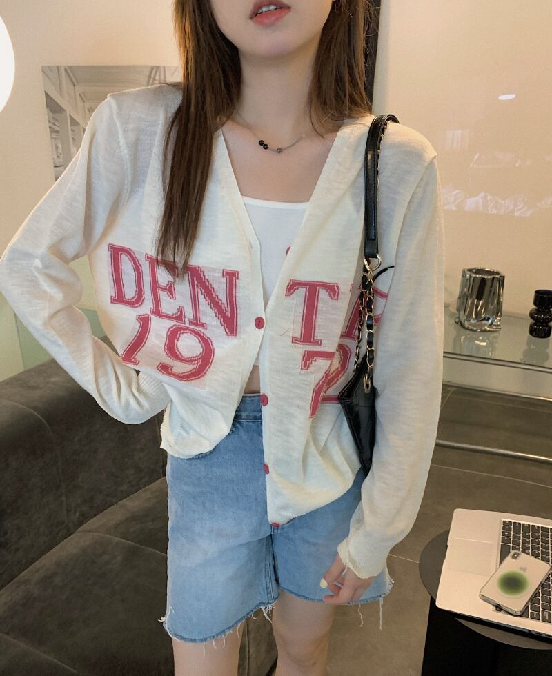 sense of chic contrast color printing sunscreen knitted cardigan women's summer 2022 new V-neck thin loose top カーディガン サマー 夏物 Vネック 0921951642282583