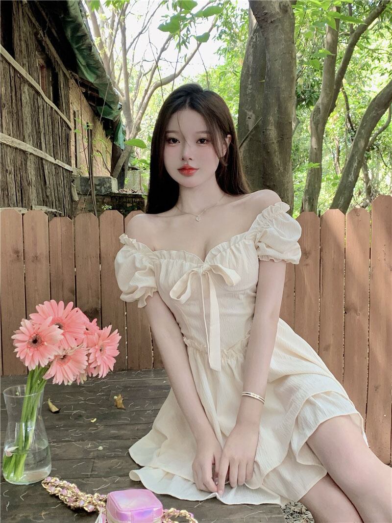 French sweet fungus edge V-neck puff sleeve dress women's summer 2022 new lace-up temperament waist A-line skirt レース 大人ガーリー スウィート キュート カジュアル サマー 夏物 スカート Vネック Aライン レースアップ 0921977251634302
