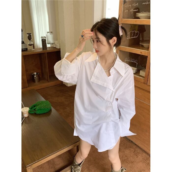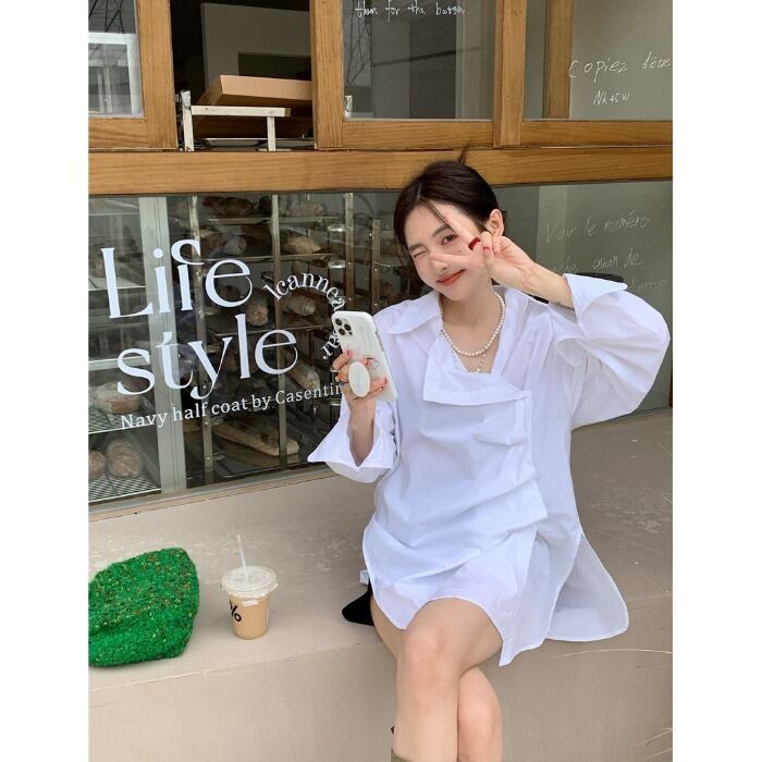sense of chic pleated white shirt women's summer 2022 new version of the lazy loose mid-length top trendy ホワイト プリーツ サマー 夏物 0921951139775257