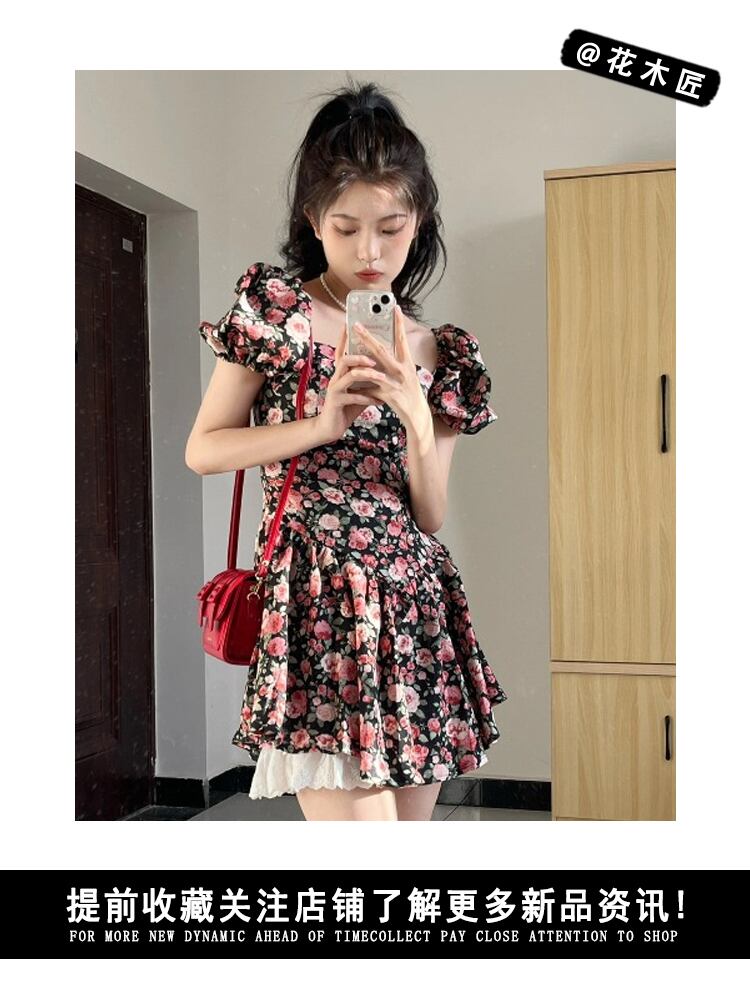 Pure desire wind square neck floral puff sleeve dress female summer 2022 new French pleated waist slim skirt プリーツ サマー 夏物 花柄 スカート スリム スクウェア 0921932736959959