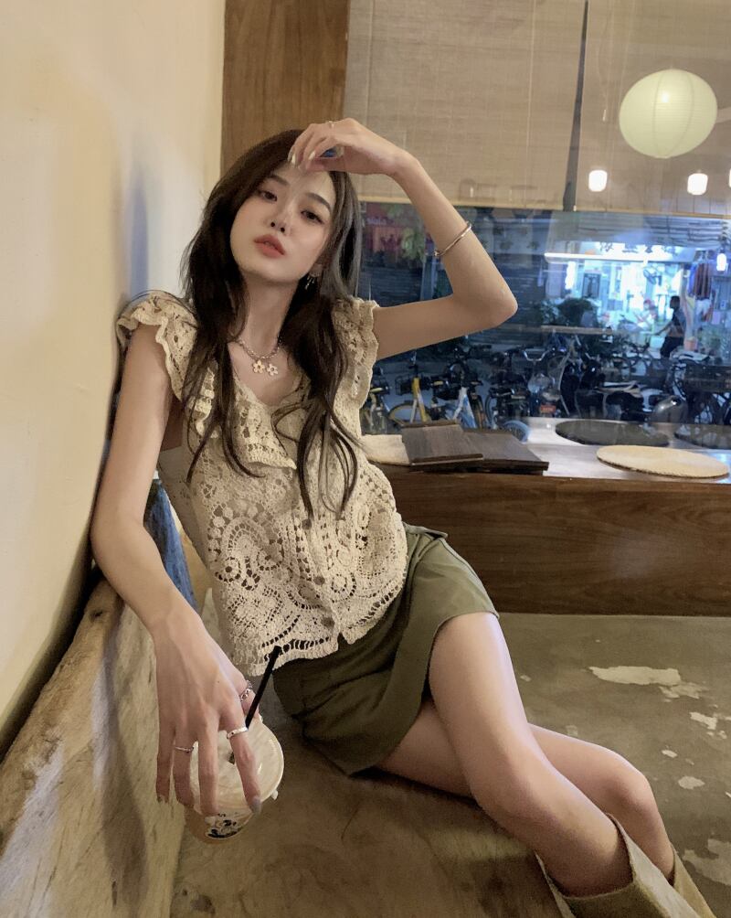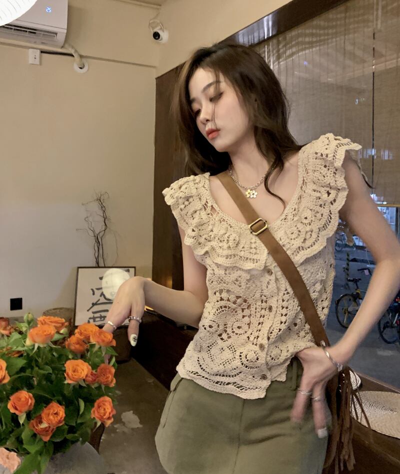 Retro ruffled hollow vest women's summer 2022 new design chic short sleeveless vest vest tide ショート レトロ 半袖 ハーフスリーブ サマー 夏物 ノースリーブ 0921988436737547