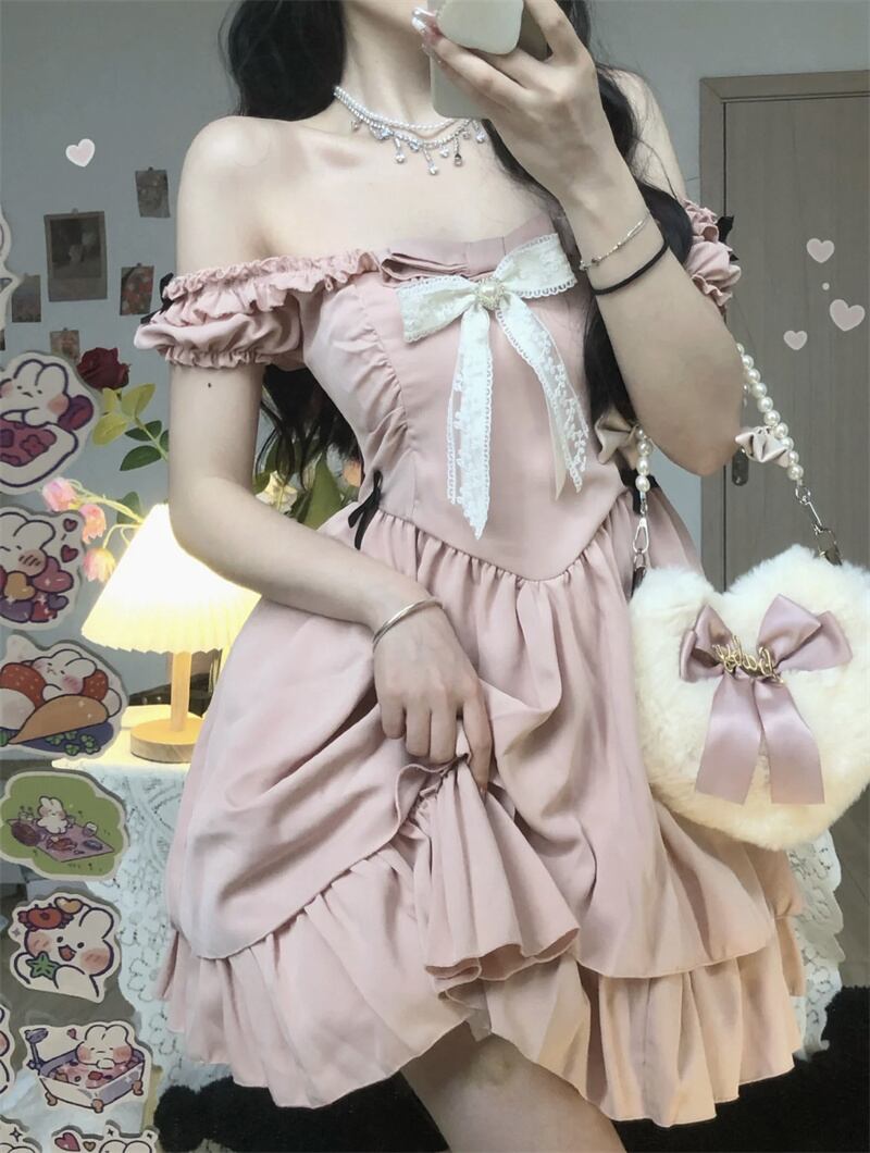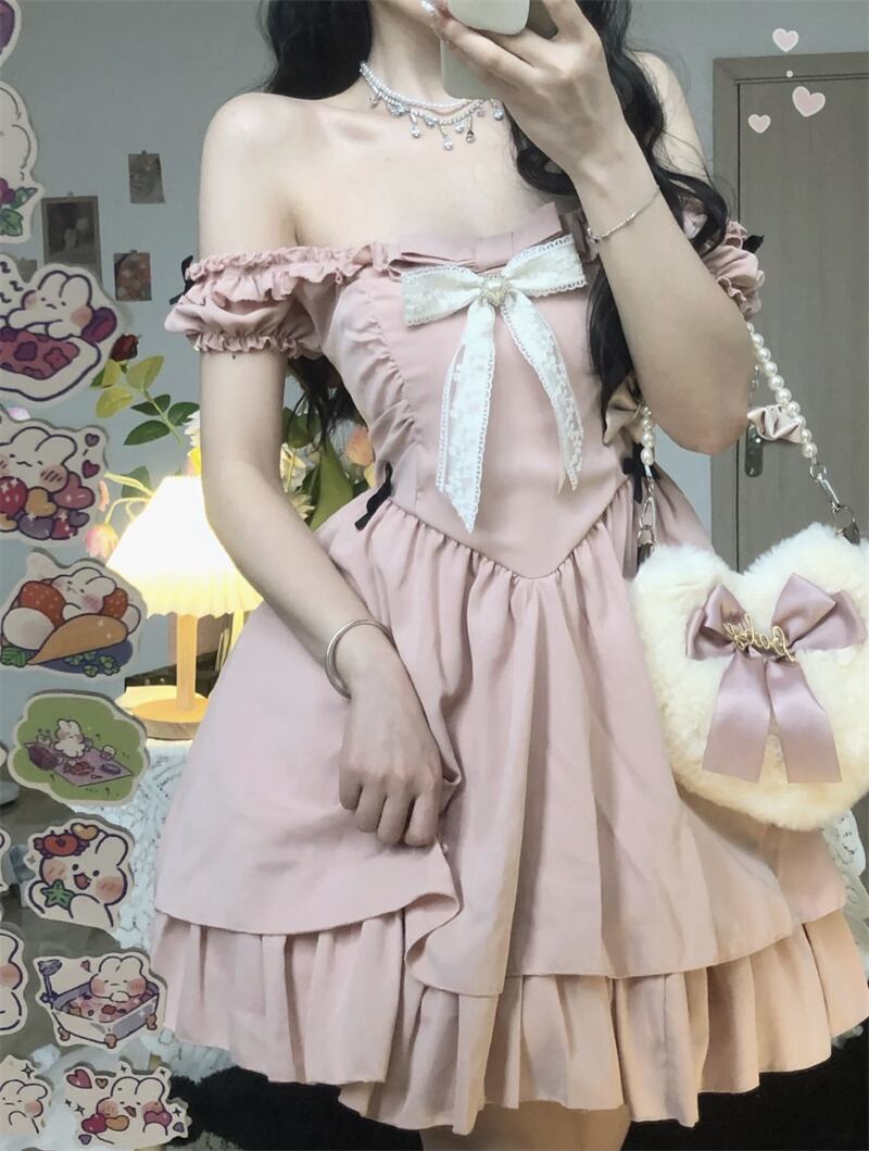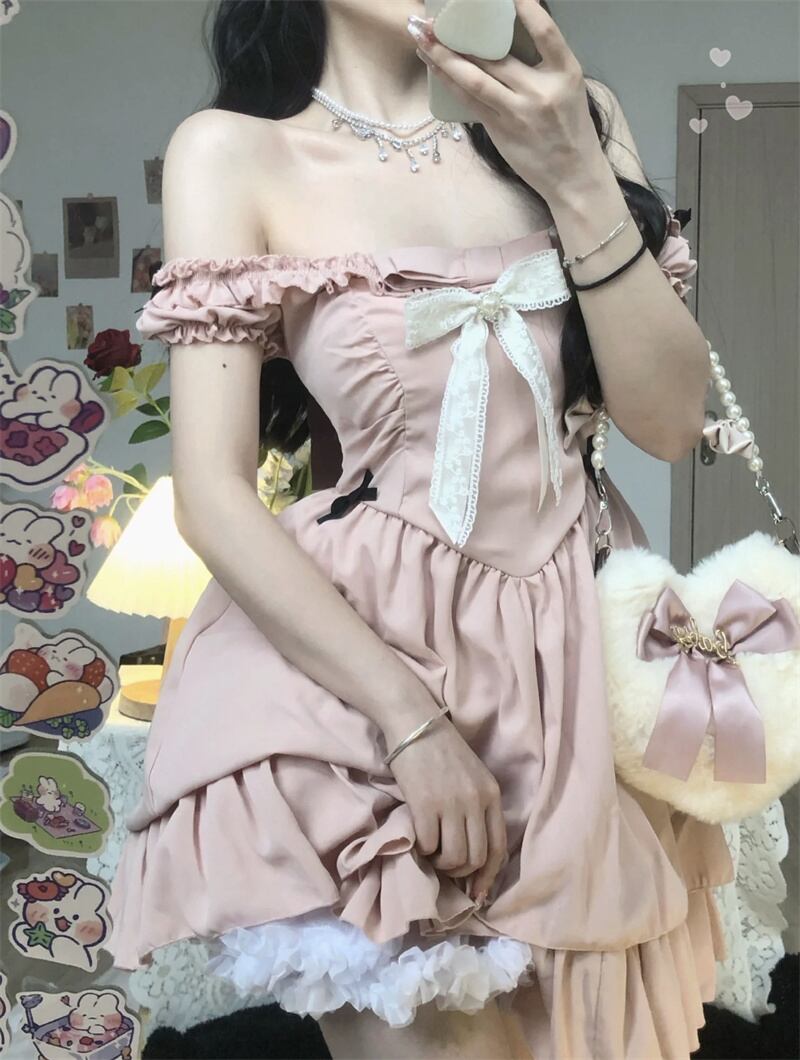 Sweet pink one-shoulder dress female summer 2022 new gentle bow fungus edge first love cake skirt ピンク リボン 大人ガーリー スウィート キュート カジュアル サマー 夏物 スカート 0921946068607548