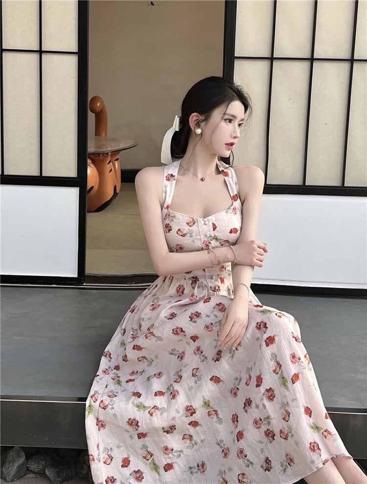 French romantic rose print halter dress women's summer 2022 new temperament waist mid-length A-line skirt サマー 夏物 スカート Aライン 0921930937931532