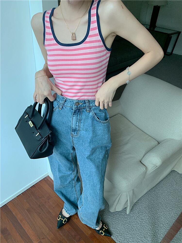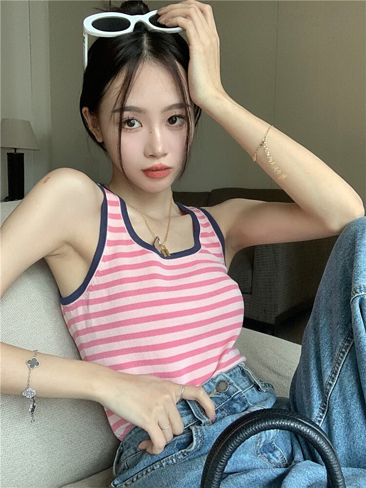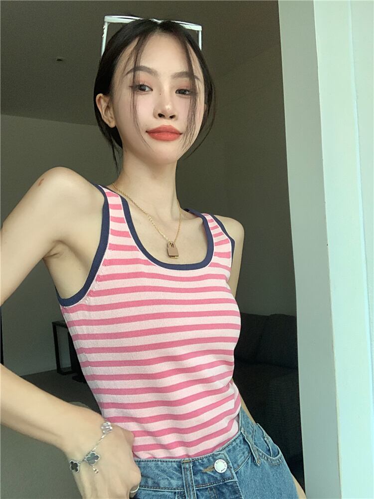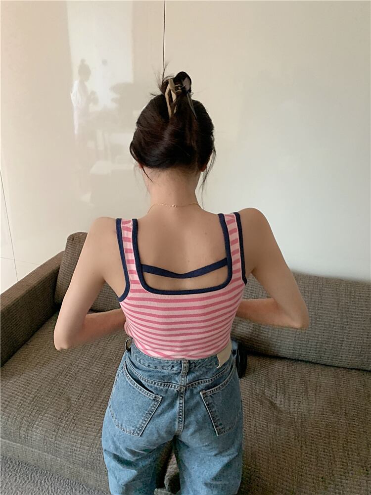 Striped knitted vest women's inner wear summer 2022 new hollow beautiful back slim short top wear trendy outside ショート サマー 夏物 ストライプ スリム 0921921388809986