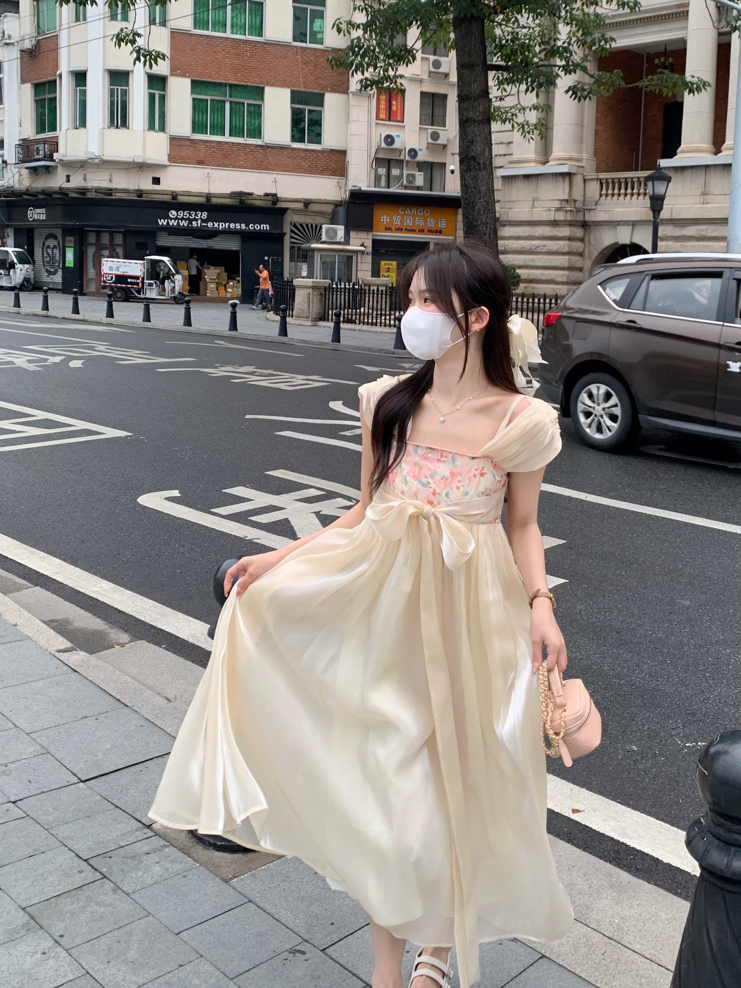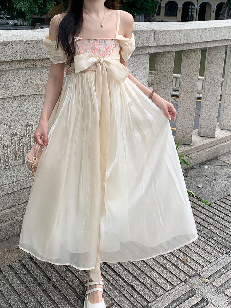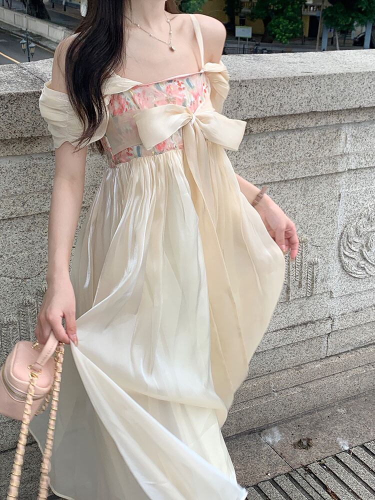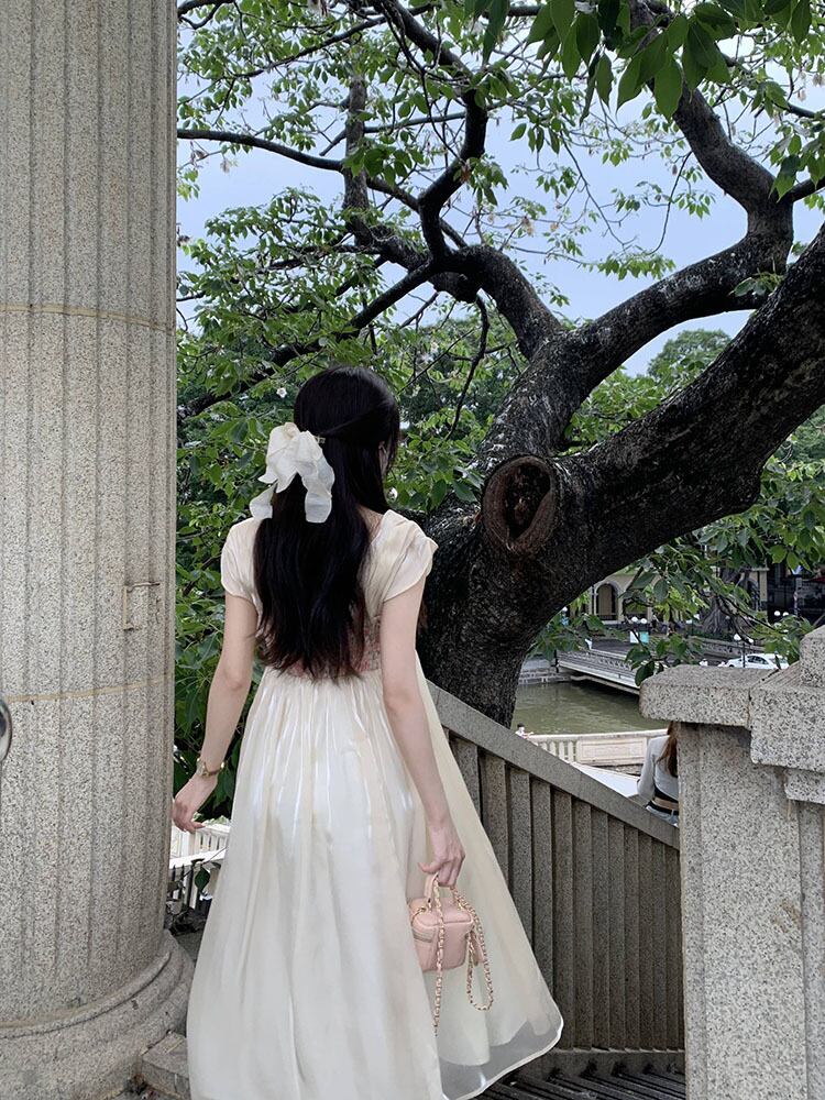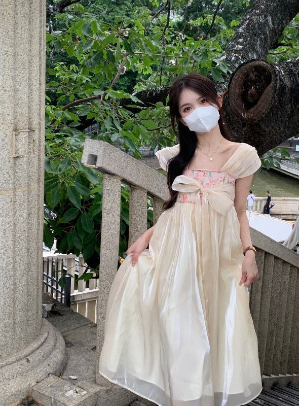 Improved Han element fairy square neck dress female summer 2022 new tie waist mid-length a-line skirt サマー 夏物 スカート Aライン スクウェア 0921941580714752