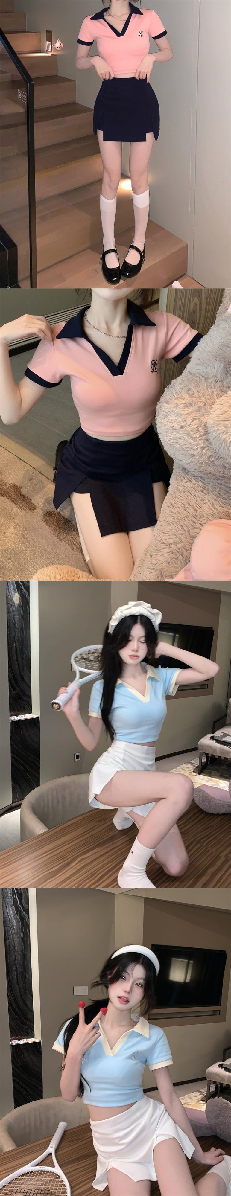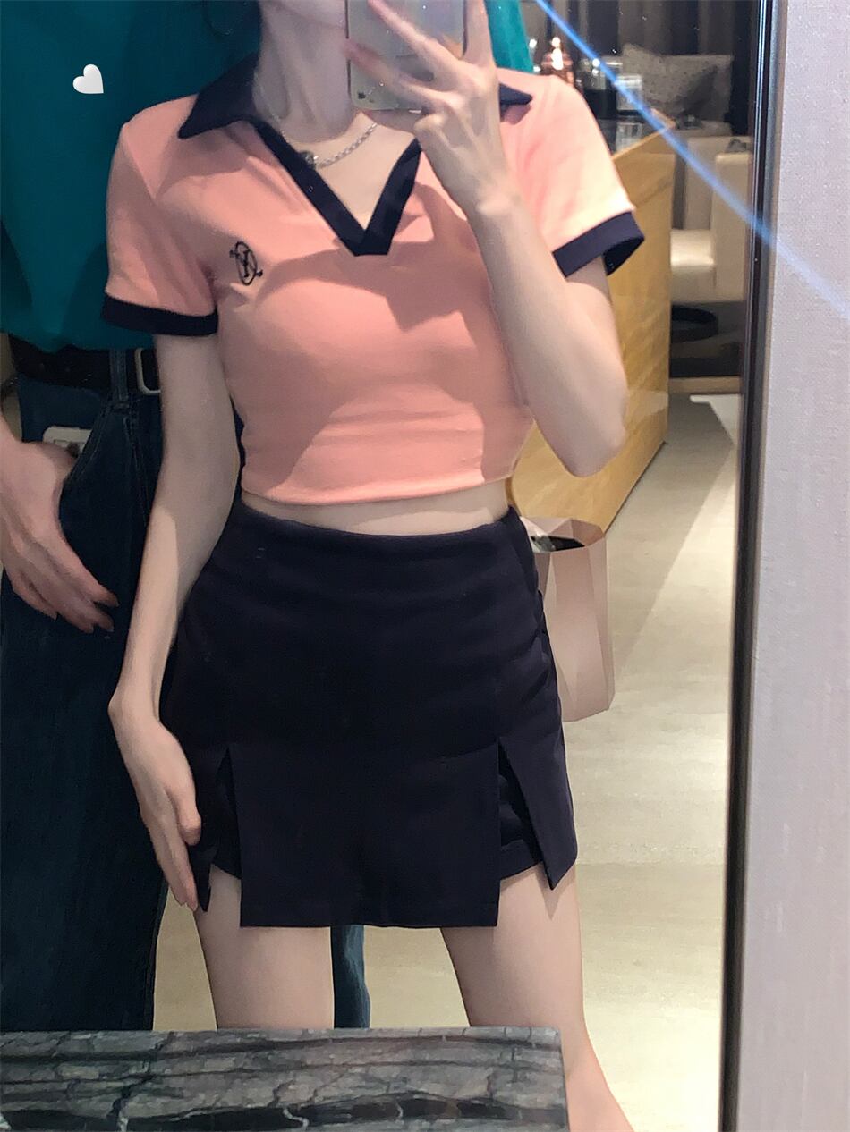 Pure desire wind contrast color polo collar short-sleeved T-shirt women's summer 2022 new temperament slim short top trendy ショート サマー 夏物 スリム Tシャツ 092194915597052