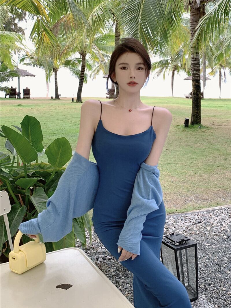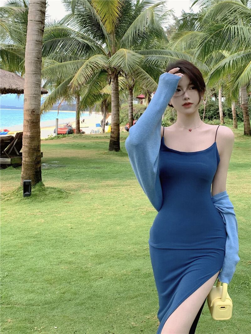 Sexy seaside suspender dress women's summer 2022 new self-cultivation backless waist mid-length slit bag hip skirt サマー 夏物 スカート 0921971345463930