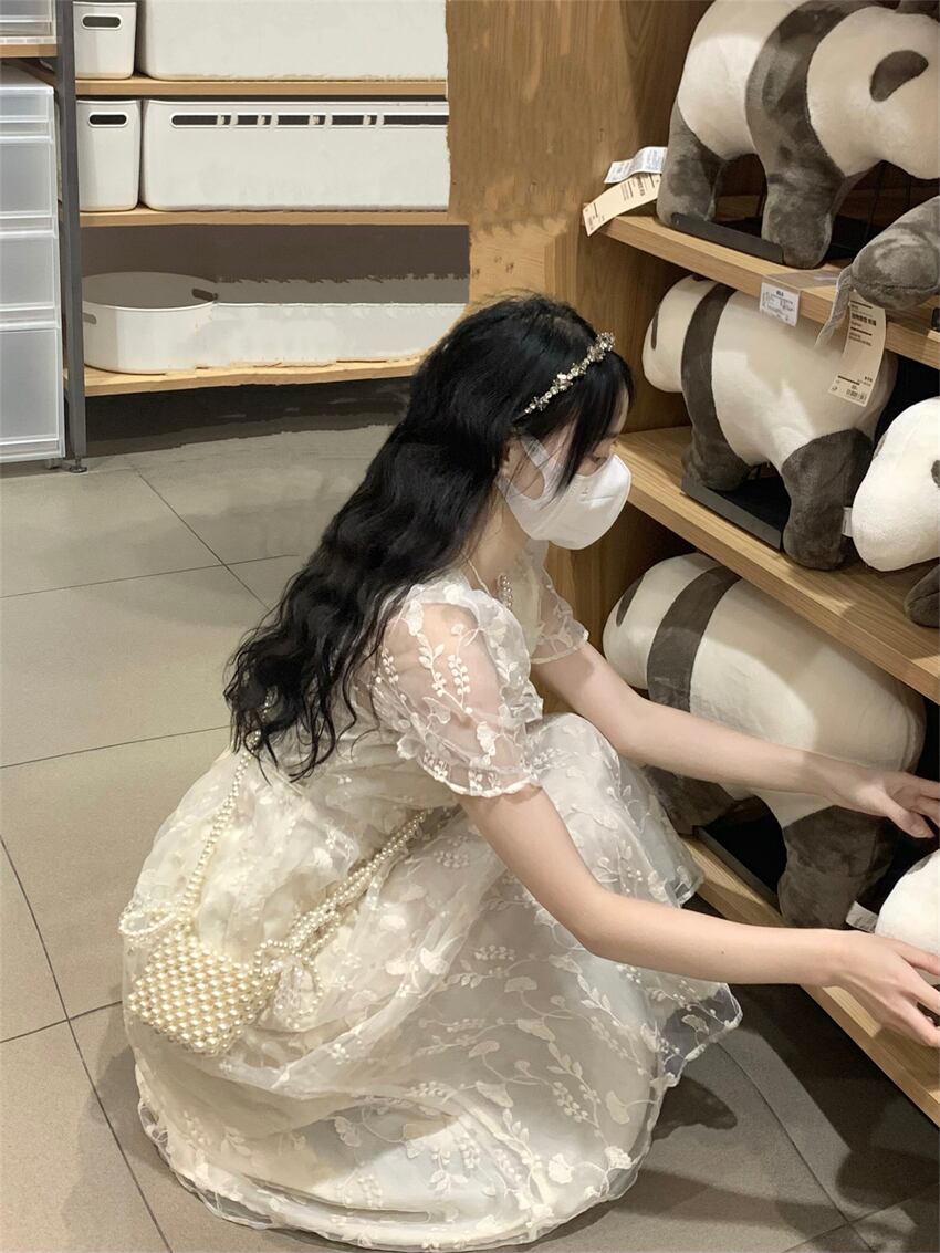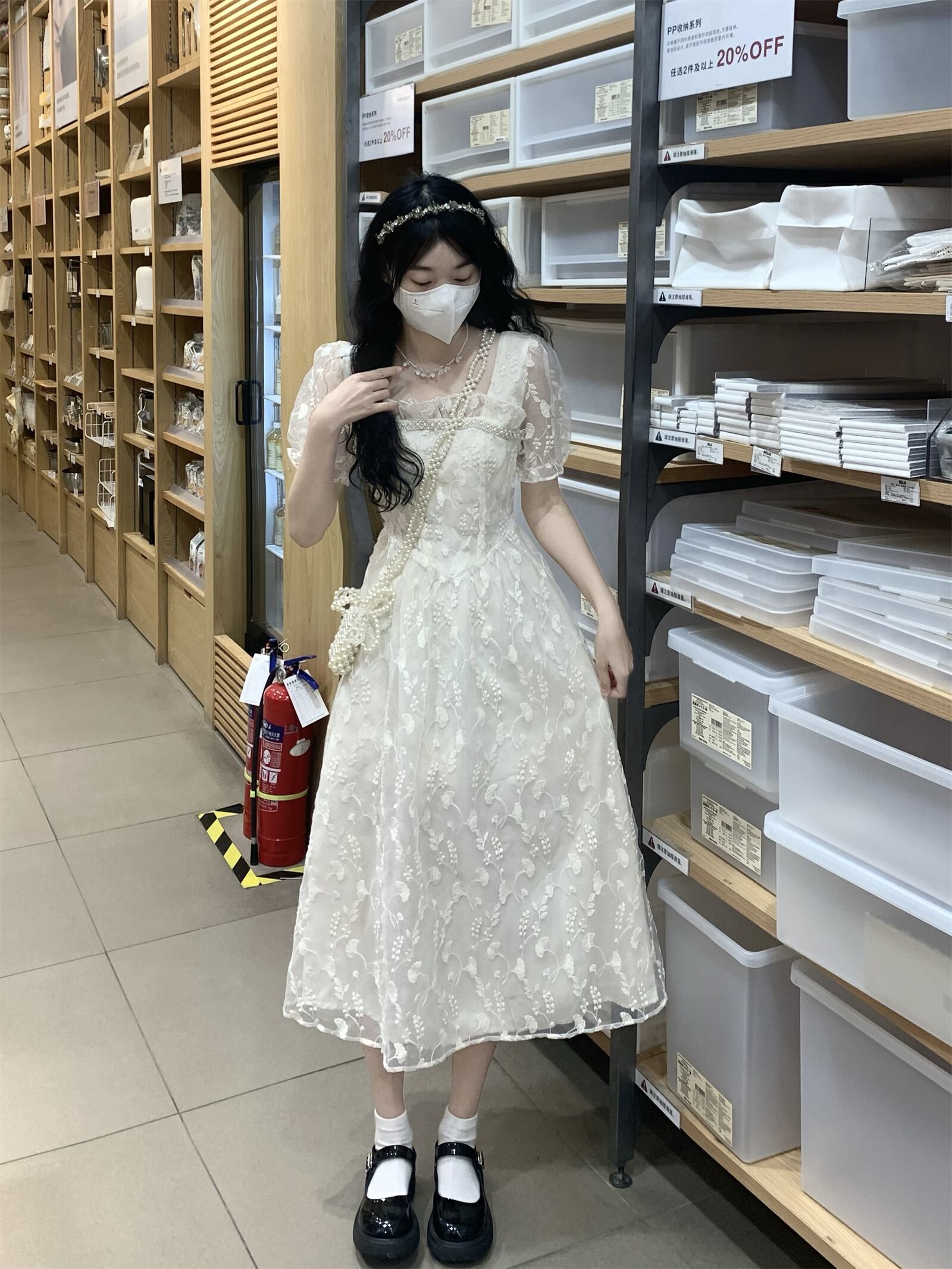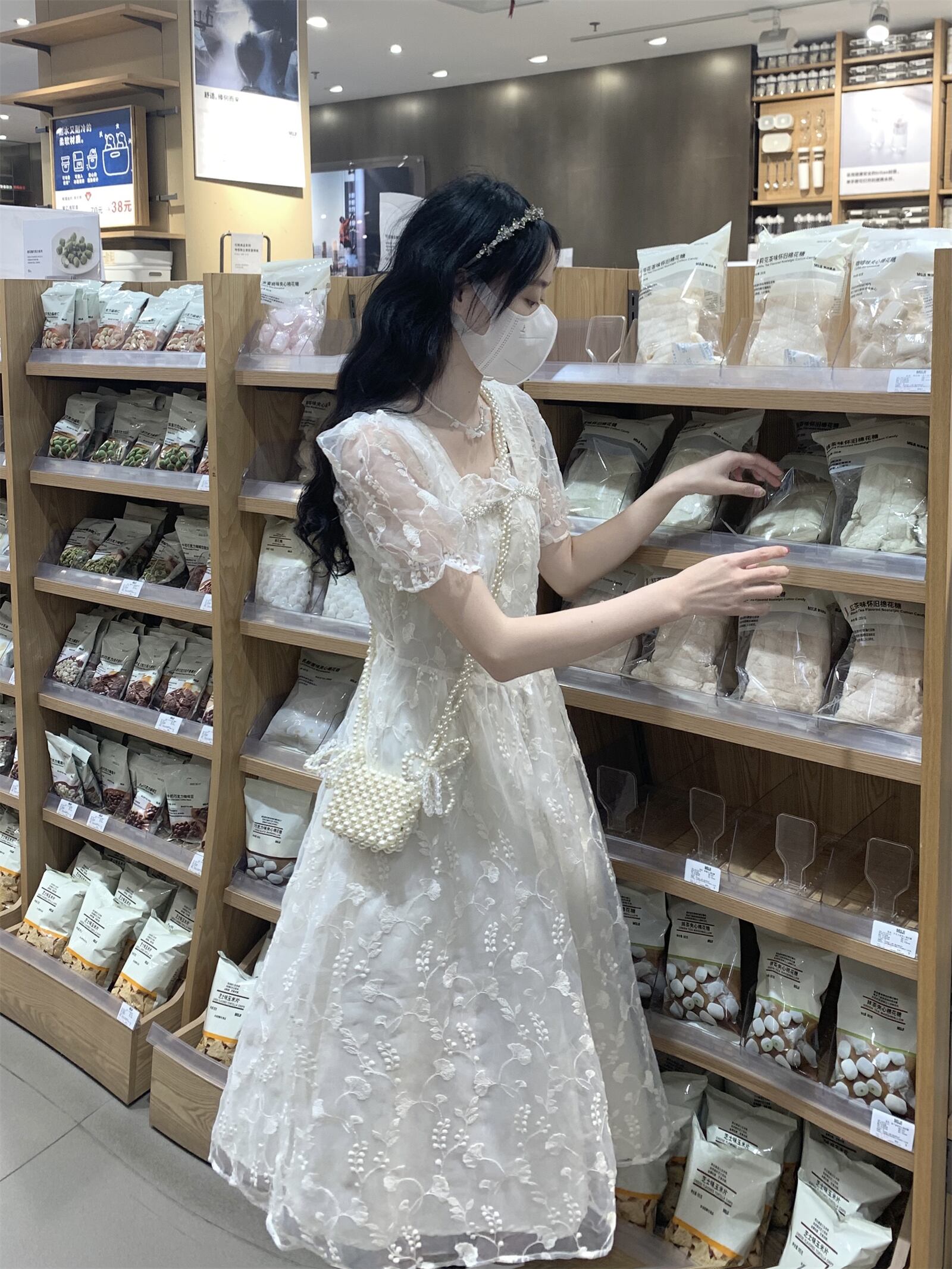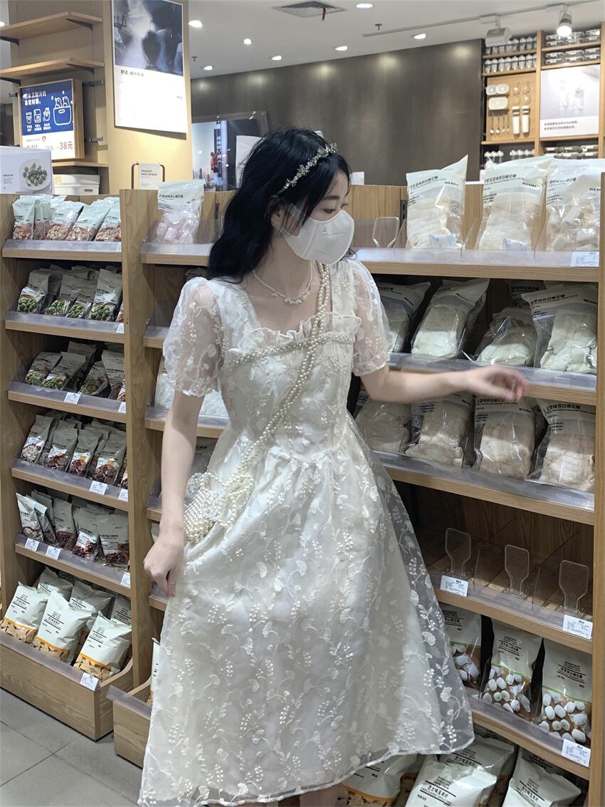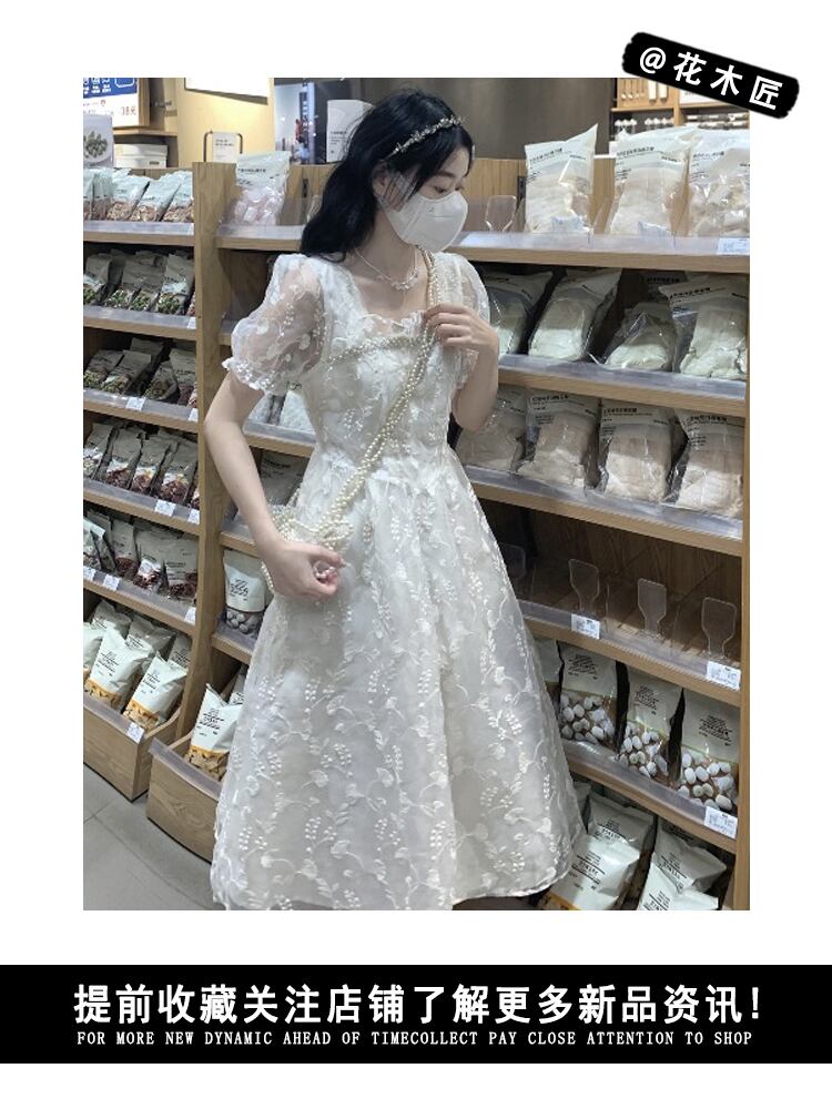 Gentle wind heavy industry jacquard embroidery square neck dress female summer 2022 new super fairy temperament waist A-line skirt 刺繍 サマー 夏物 スカート Aライン スクウェア 0921923273389669