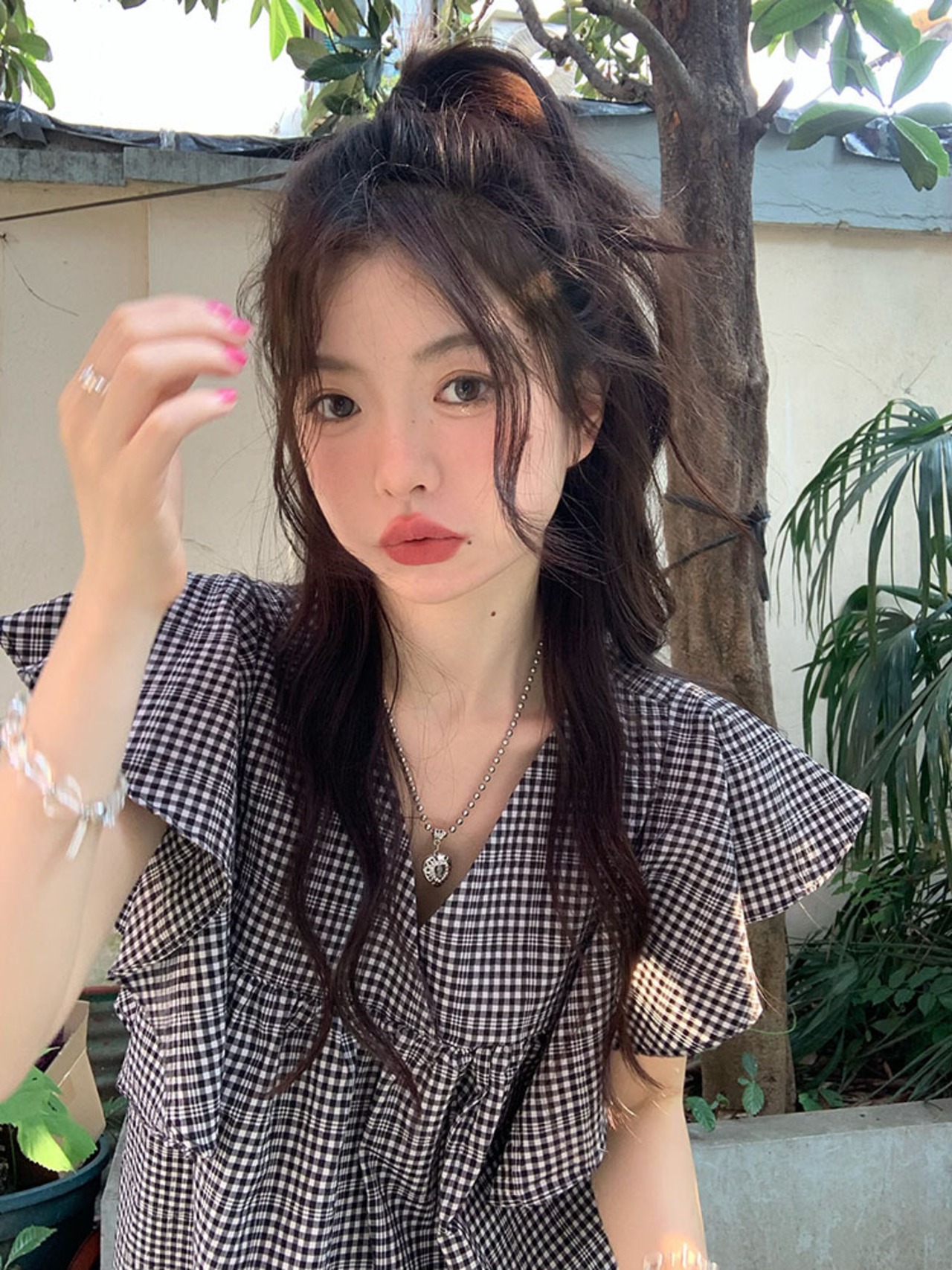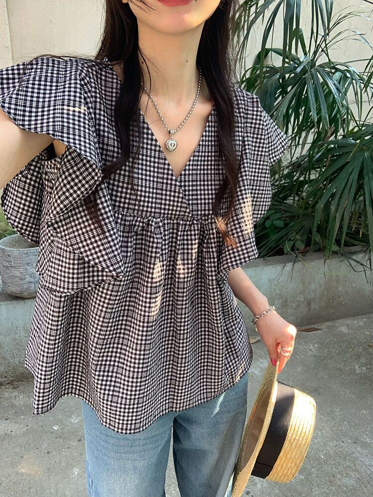French ruffled plaid fly-sleeve shirt women's summer 2022 new design small V-neck all-match top サマー 夏物 Vネック 0921913279890154