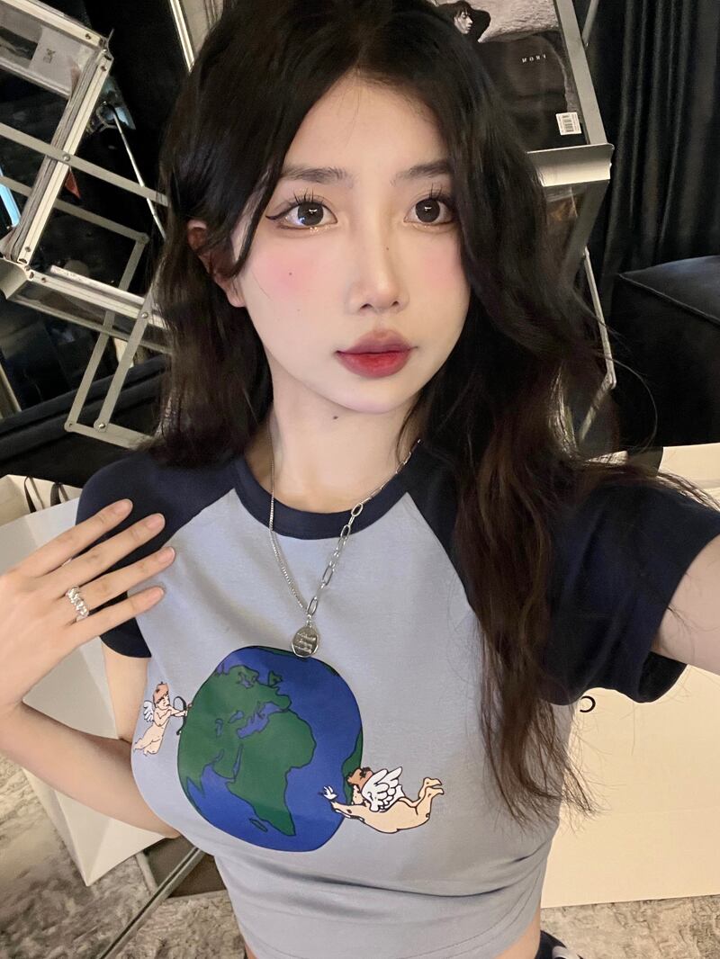 Pure desire exposed navel hit color short-sleeved T-shirt women's summer 2022 new version temperament printing short top ins ショート サマー 夏物 Tシャツ 0921953282428154