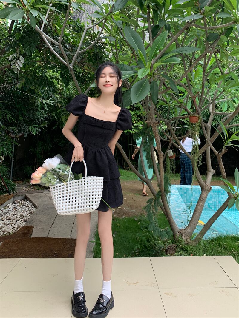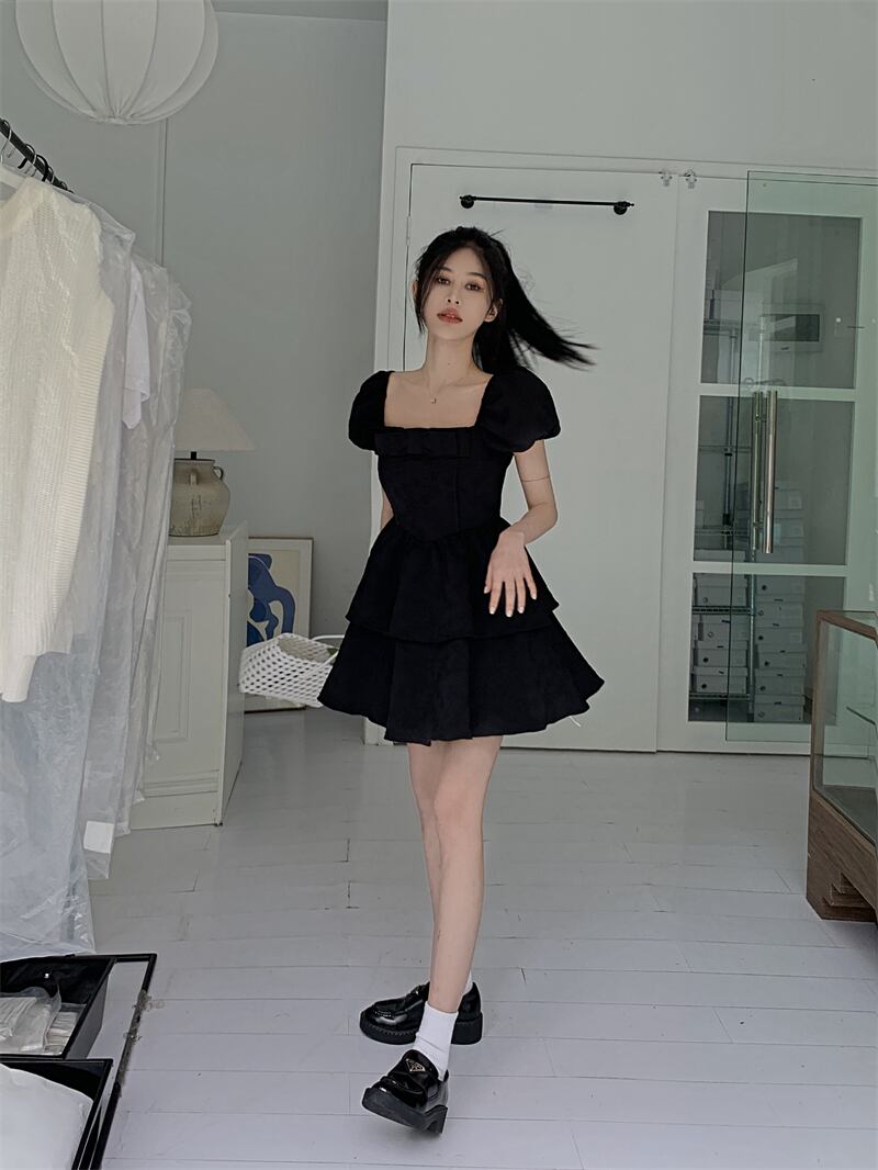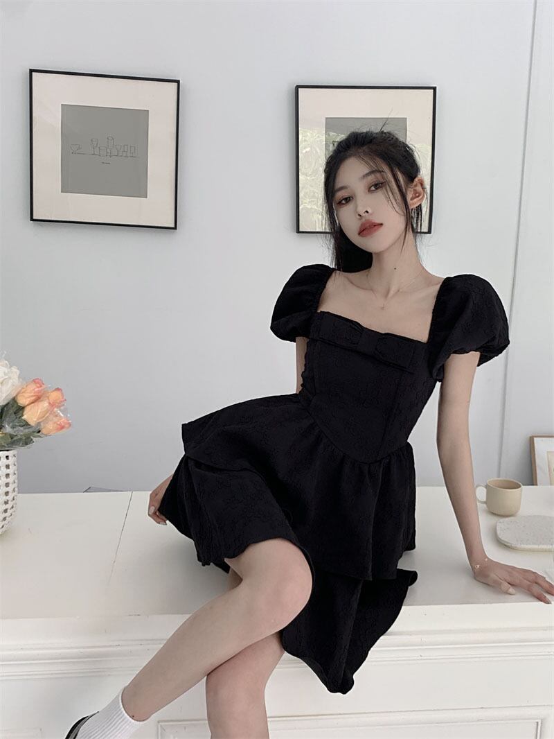 Black bow square neck puff sleeve dress women's summer 2022 new Hepburn style waist puffy cake skirt ブラック リボン サマー 夏物 スカート スクウェア 092191692967694