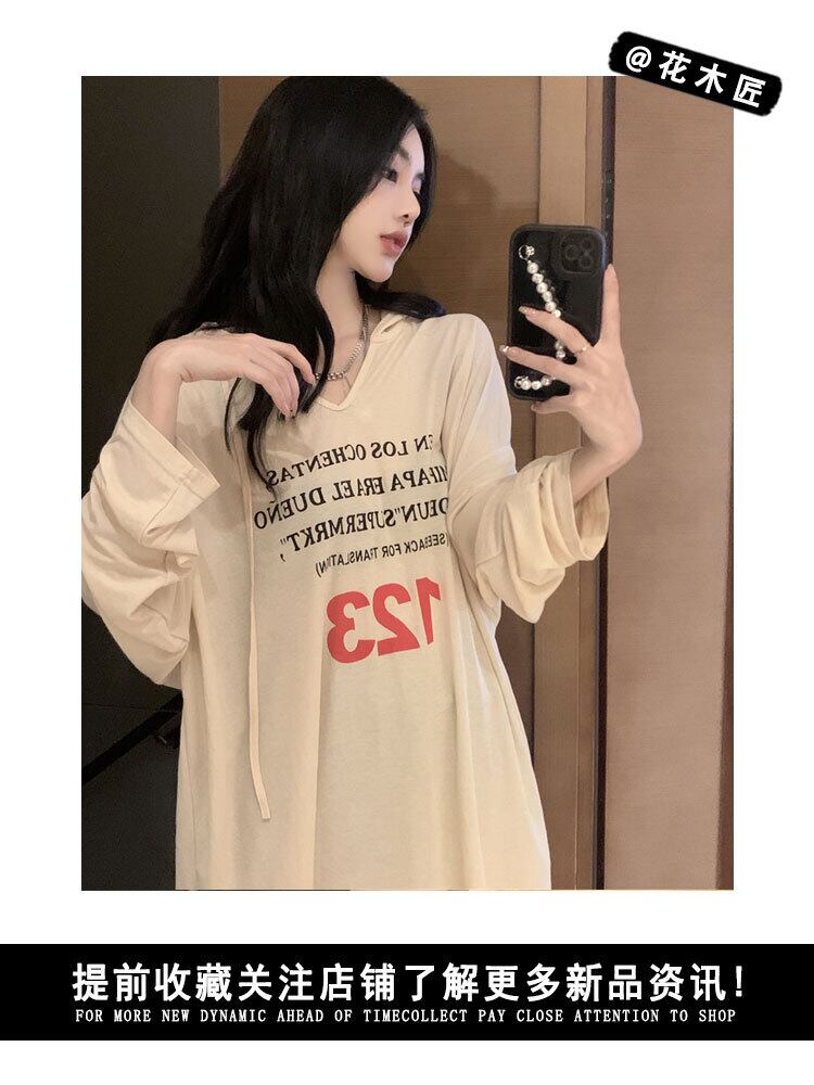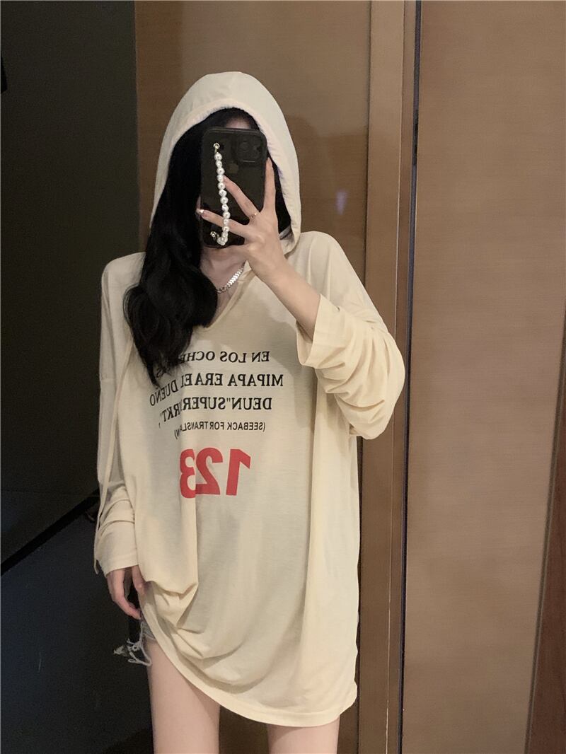 Thin sunscreen shirt hooded long-sleeved t-shirt women's summer 2022 new design sense printing loose mid-length top ロング サマー 夏物 Tシャツ 0921991411288635