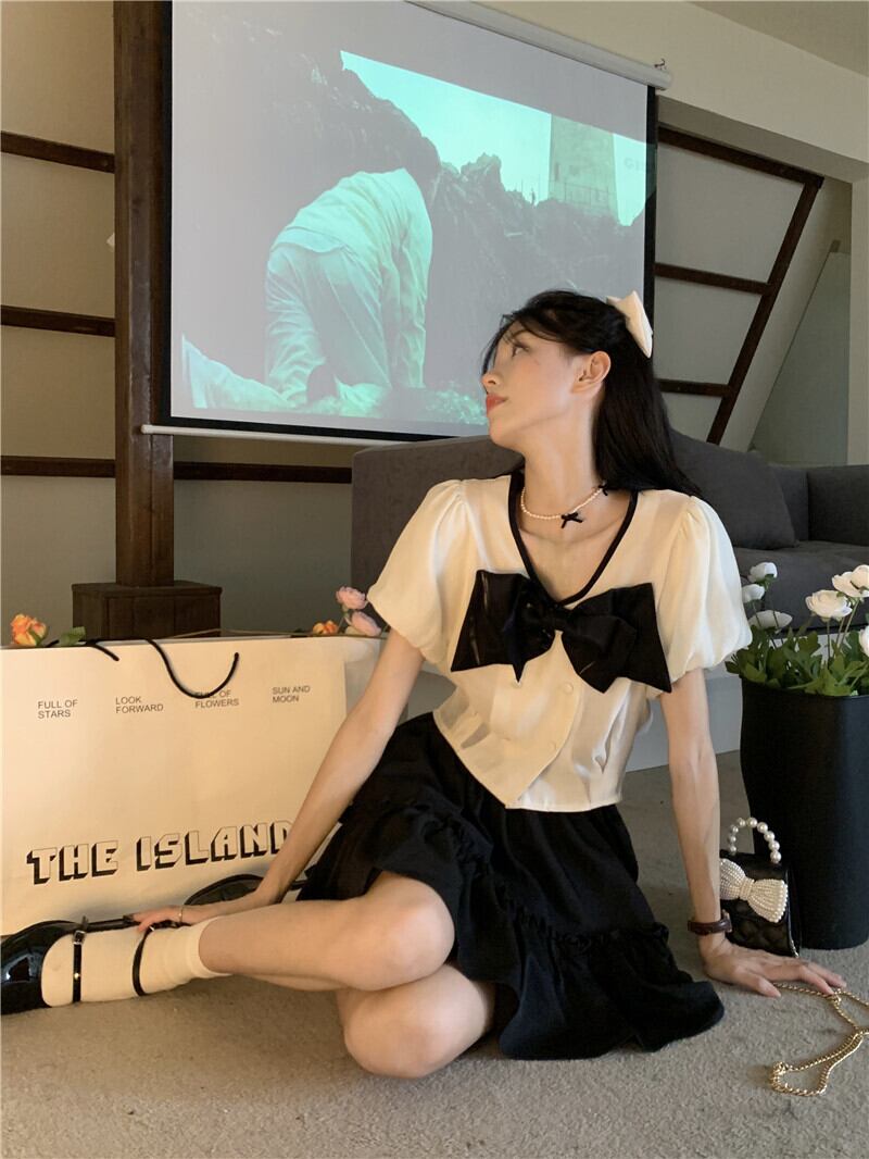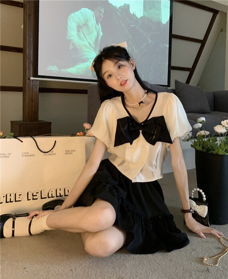 Chic color-blocking bow puff sleeve shirt women's summer 2022 new western style age-reducing v-neck short top trendy ショート リボン サマー 夏物 Vネック 0921985017071350