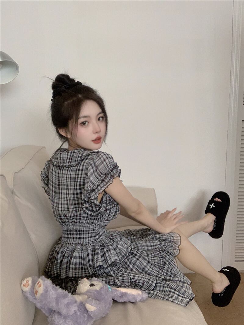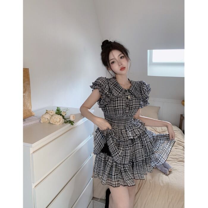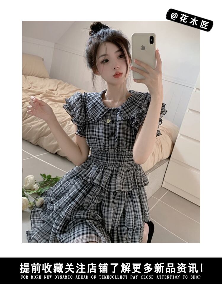 French fungus edge flying sleeve plaid dress female summer 2022 new chic doll collar waist cake skirt サマー 夏物 スカート 0921916915882890