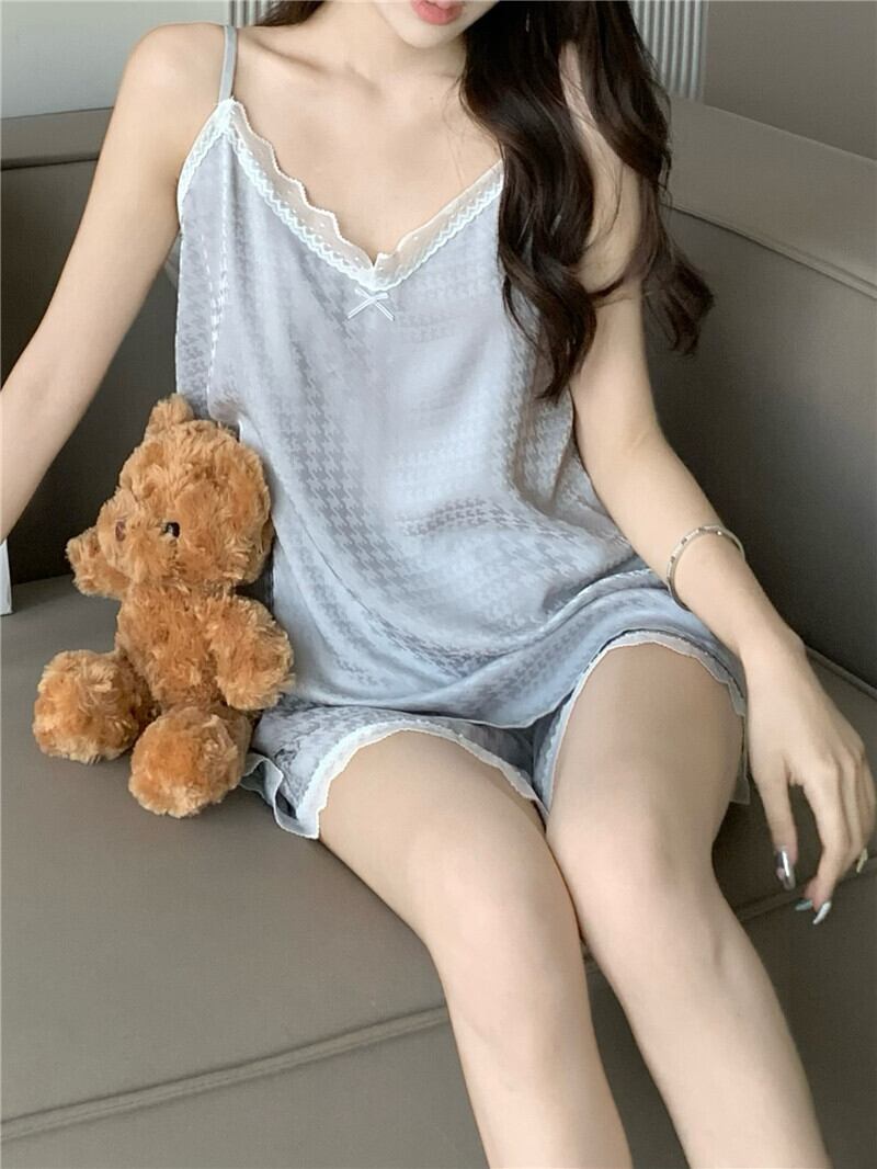 Sexy houndstooth suspenders pajamas suit women's summer 2022 new net red lace edge home clothes two-piece tide レッド レース サマー 夏物 0921966784069255