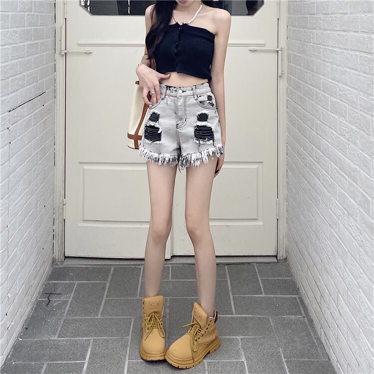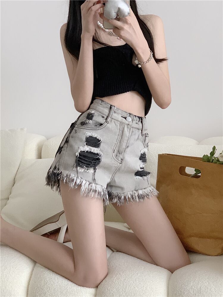Hot ripped high-waisted jeans women's summer 2022 new design chic loose wide-leg shorts trendy サマー 夏物 ショーツ ブルマー 0921958491797174