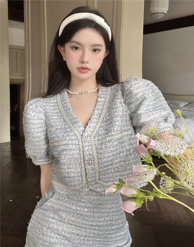 -quality small fragrance style V-neck puff sleeve jacket women's summer 2022 new chic temperament thin short top ショート サマー 夏物 Vネック 0921944418526271