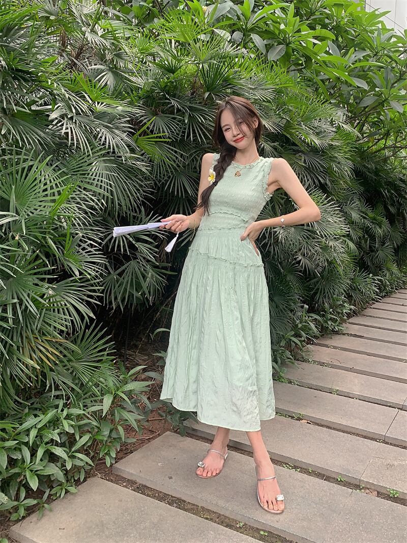 -quality pleated green sleeveless dress women's summer 2022 new fungus edge waist mid-length skirt tide プリーツ サマー 夏物 ノースリーブ スカート グリーン 0921996613686664