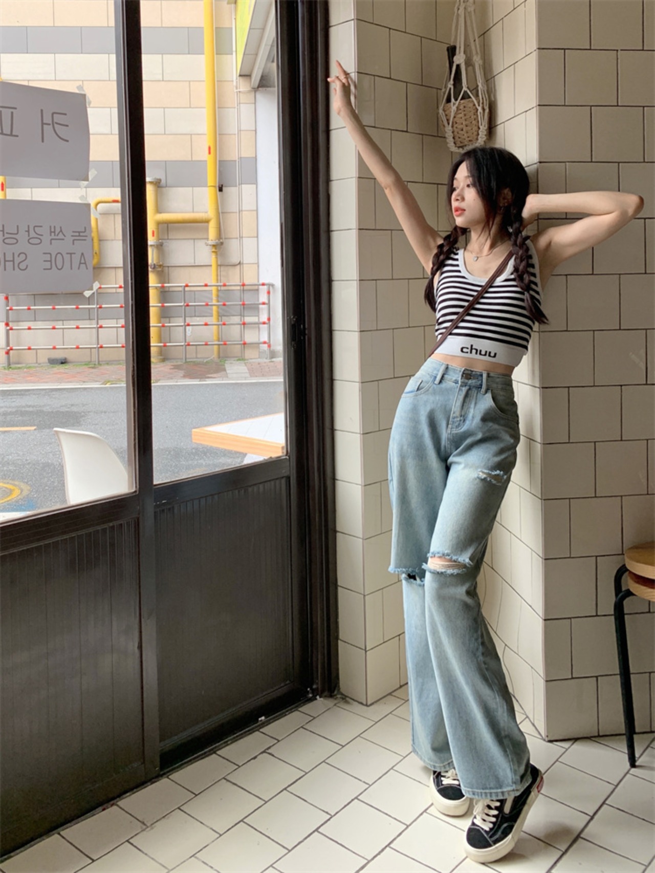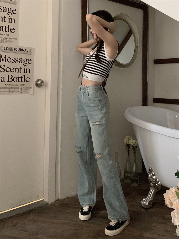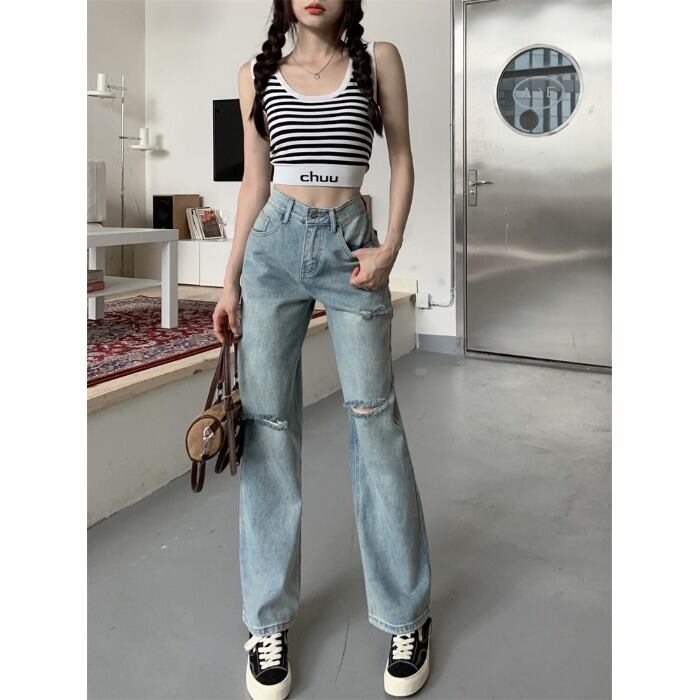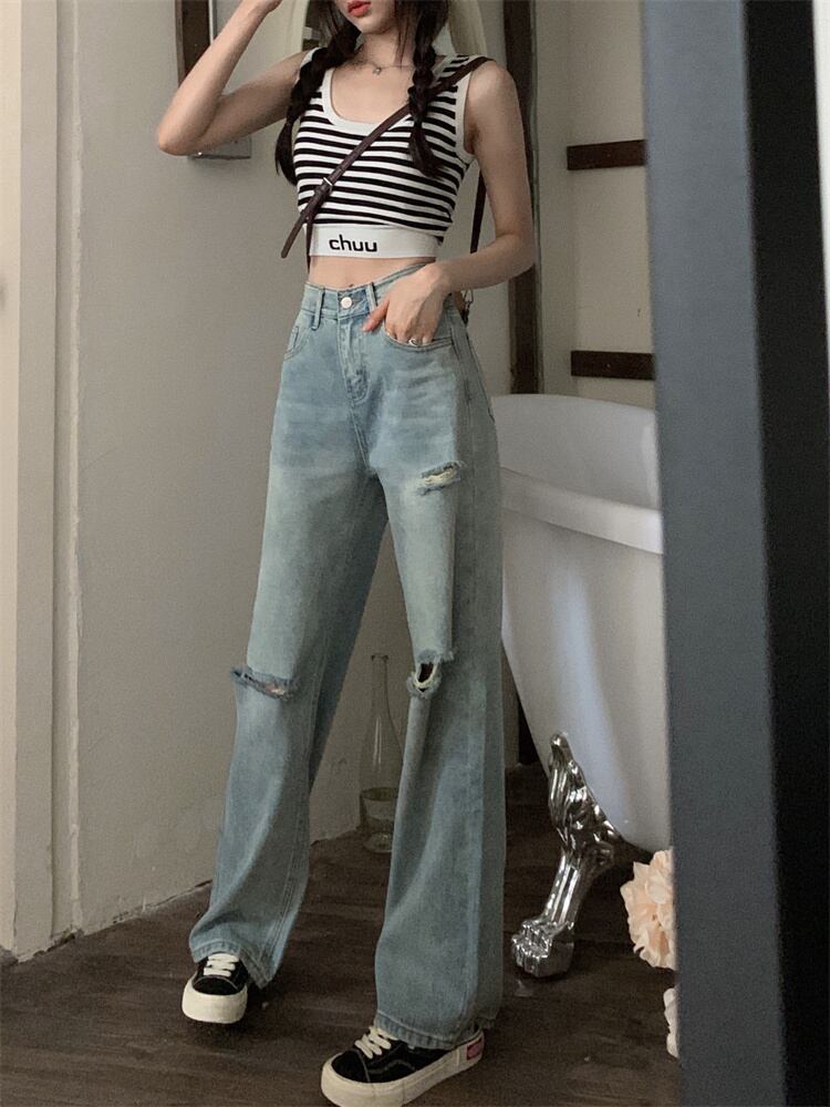 Hot chic ripped high-waisted jeans women's high street ins summer 2022 new version was thin and slightly flared pants レッド ストリート サマー 夏物 0921925596303016