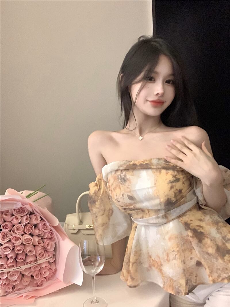 Pure desire and gentle one-shoulder chiffon floral shirt women's summer 2022 new sweet temperament waist short top ショート シフォン 大人ガーリー スウィート キュート カジュアル サマー 夏物 花柄 0921988438191565