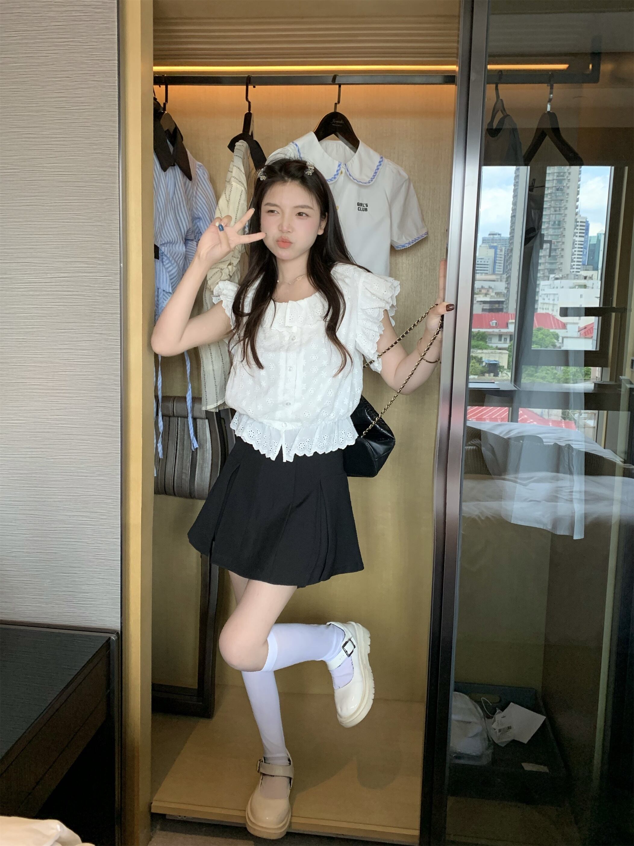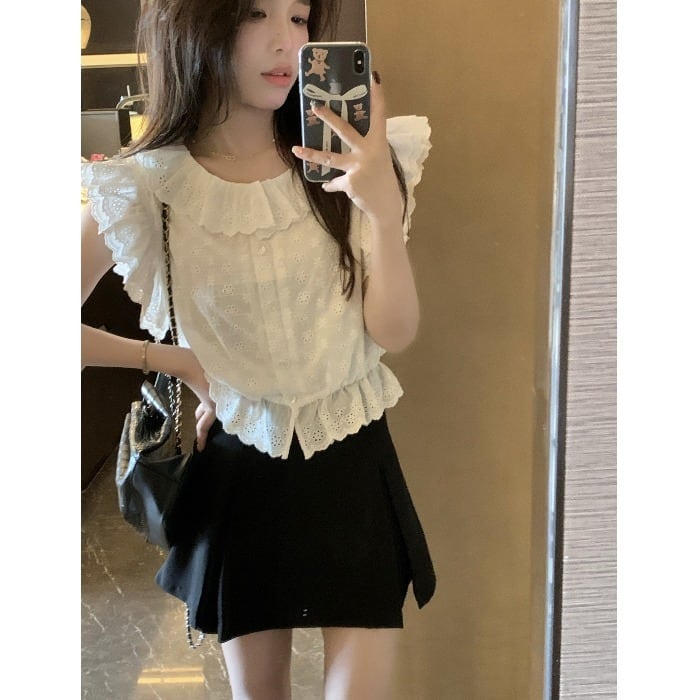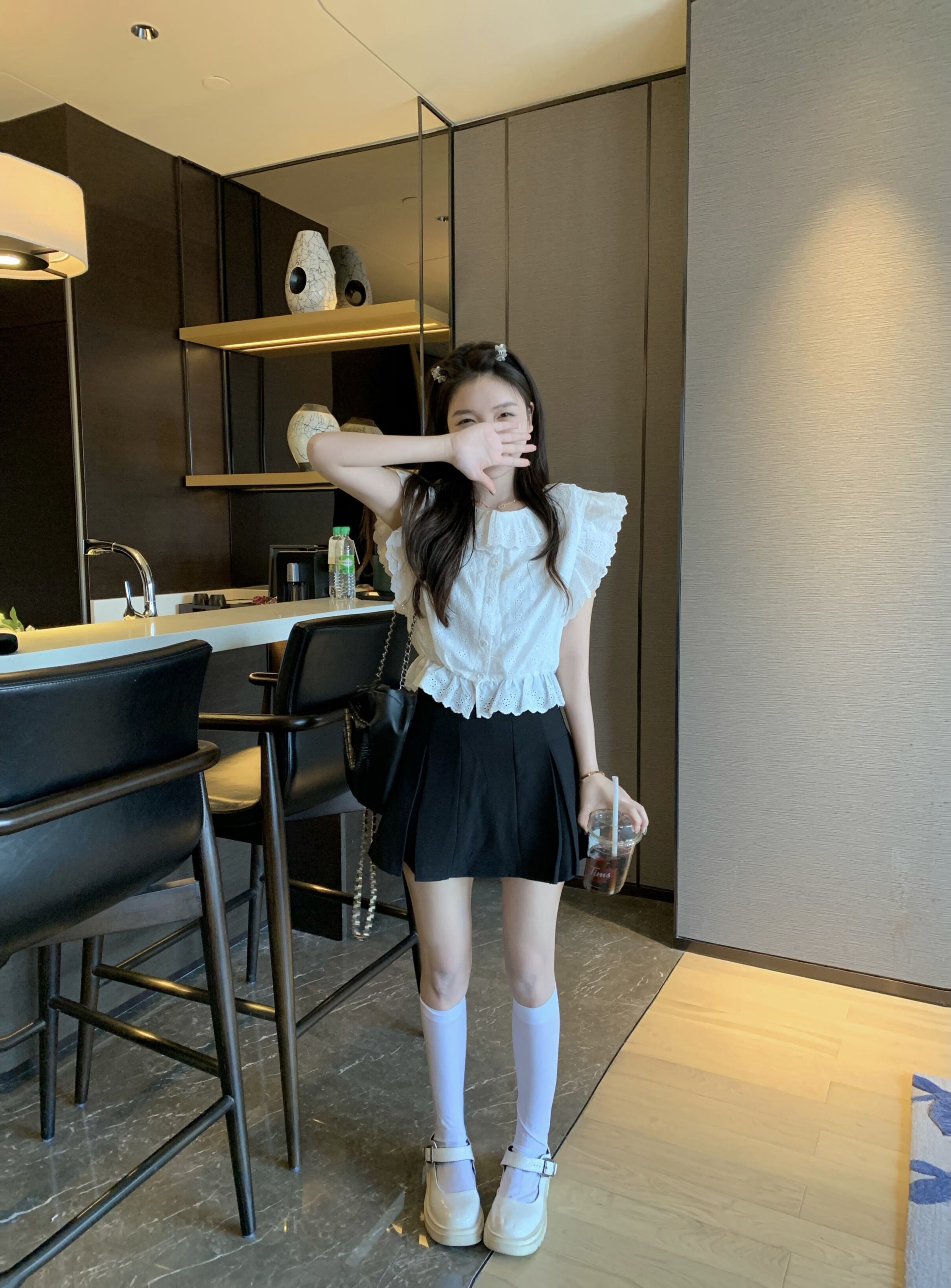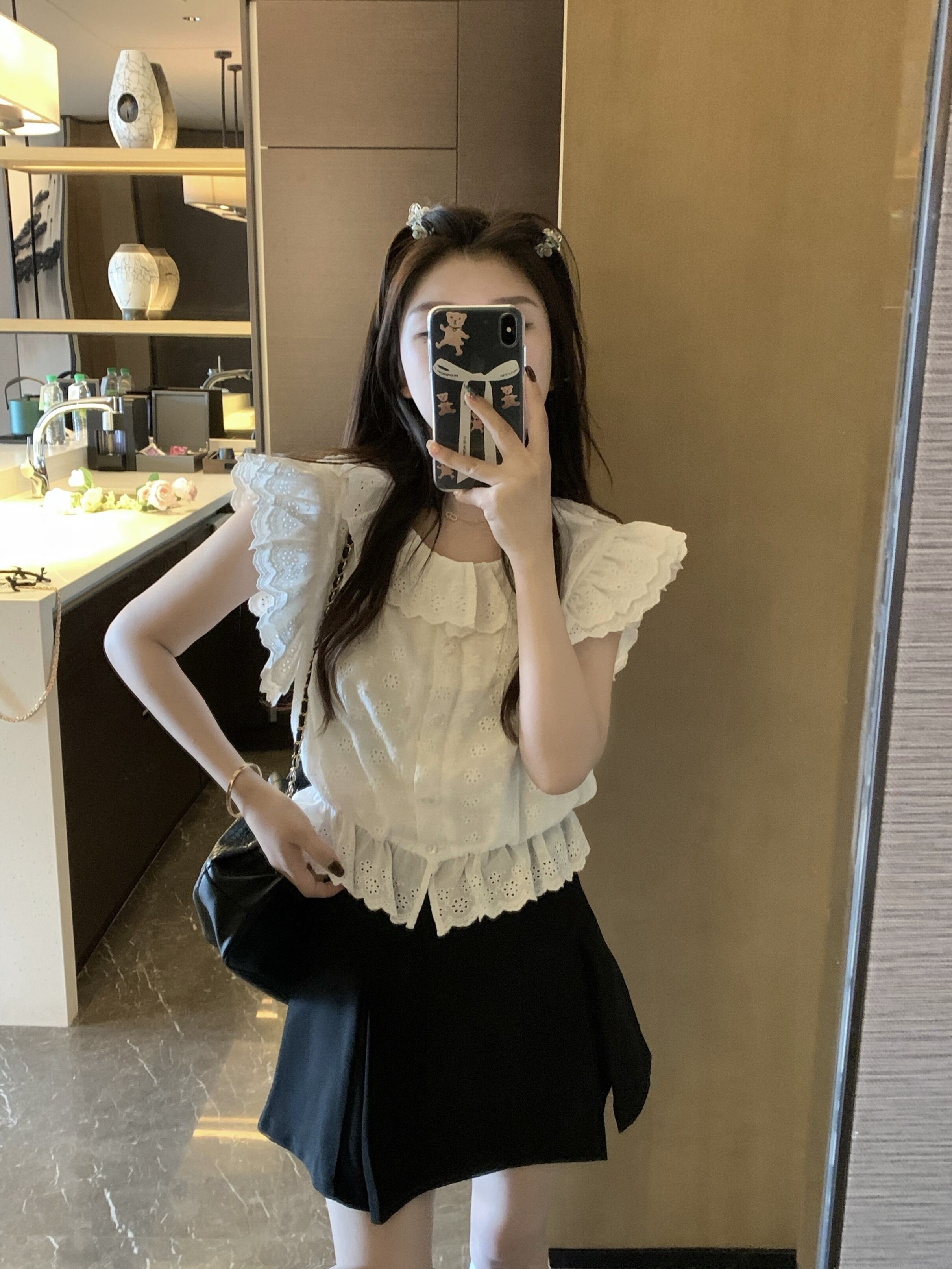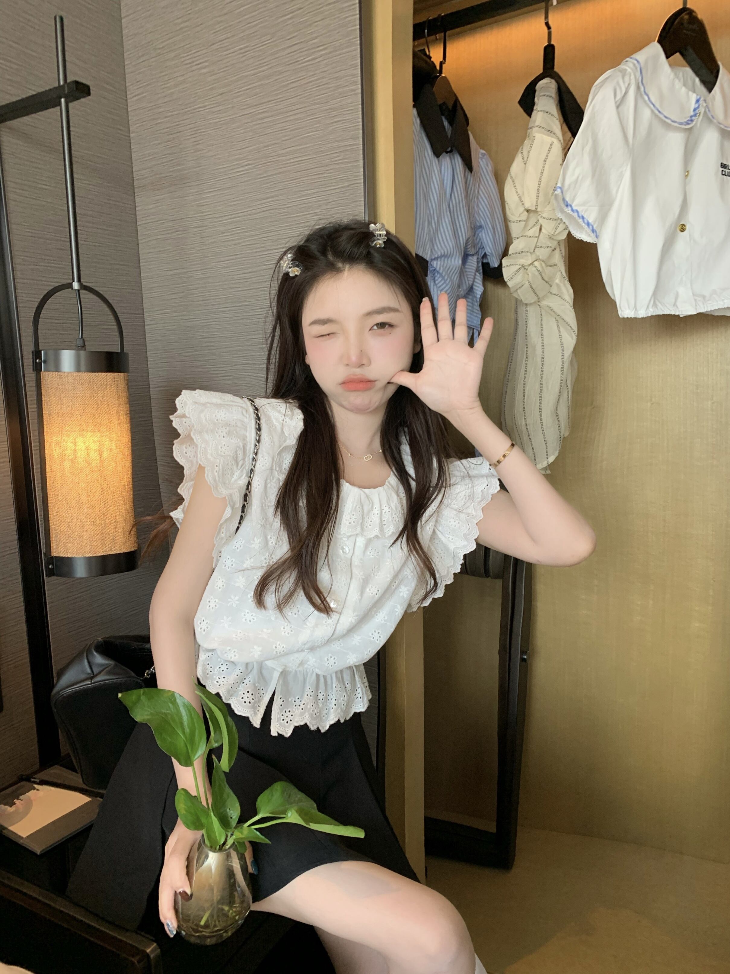 sweet heavy industry lace flying sleeve shirt women's summer 2022 new short slim fit design top ショート レース 大人ガーリー スウィート キュート カジュアル サマー 夏物 スリム 0921959567742291